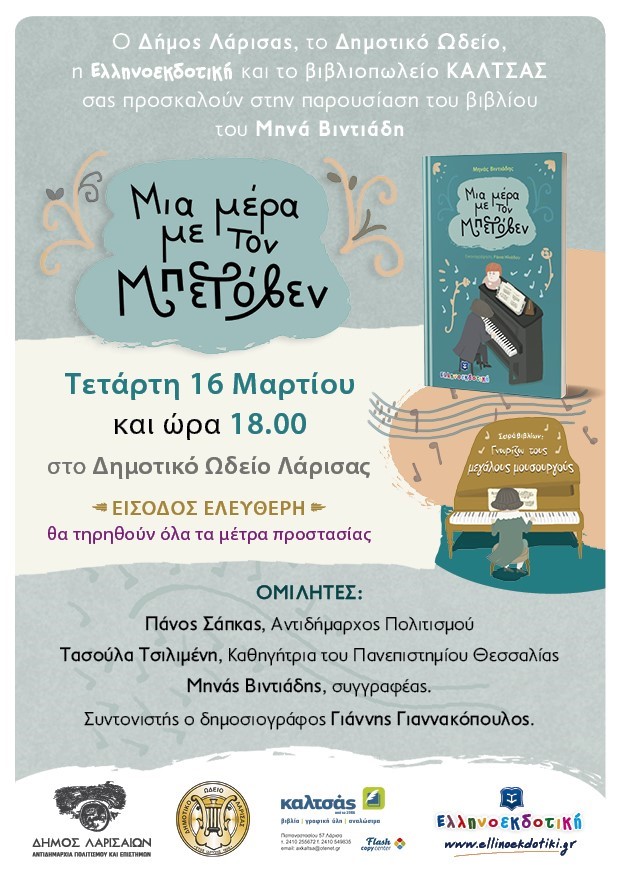 Η Αντιδημαρχία Πολιτισμούς & Επιστημών Δήμου Λαρισαίων, το Δημοτικό Ωδείο Λάρισας, η ΕΛΛΗΝΟΕΚΔΟΤΙΚΗ και το βιβλιοπωλείο ΚΑΛΤΣΑΣ, διοργανώνουν την παρουσίαση του βιβλίου του Μηνά Βιντιάδη “Μια μέρα με τον Μπετόβεν” την Τετάρτη 16 Μαρτίου και ώρα 18:00 στο Δημοτικό Ωδείο Λάρισας.