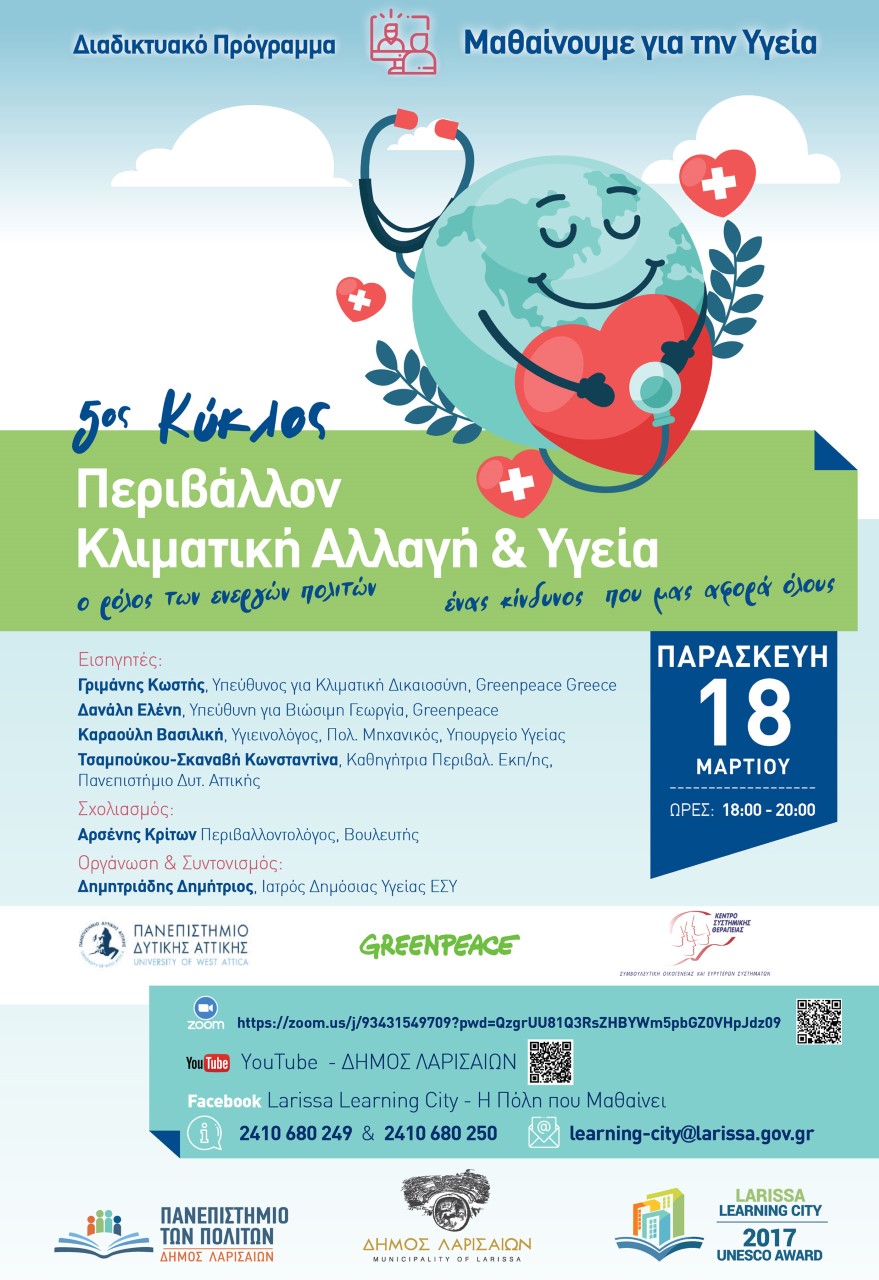 Σε μια περίοδο πρωτόγνωρης υγειονομικής κρίσης το «Πανεπιστήμιο των Πολιτών» του Δήμου Λα-ρισαίων επικεντρώνει την προσοχή του στην προστασία της Δημόσιας Υγείας και ανακοινώνει την έναρξη του 5ου κύκλου διαδικτυακού Επιμορφωτικού Προγράμματος με τίτλο «Μαθαίνουμε για την Υγεία”. Ο 5ος Κύκλος Μαθημάτων “Περιβάλλον, Κλιματική Αλλαγή & Υγεία” θα υλοποιηθεί διαδικτυακά στις 18 Μαρτίου 2022, ώρες 18:00-20:00.