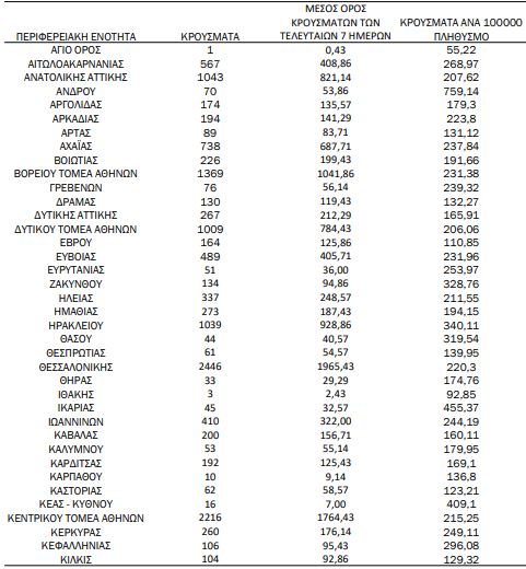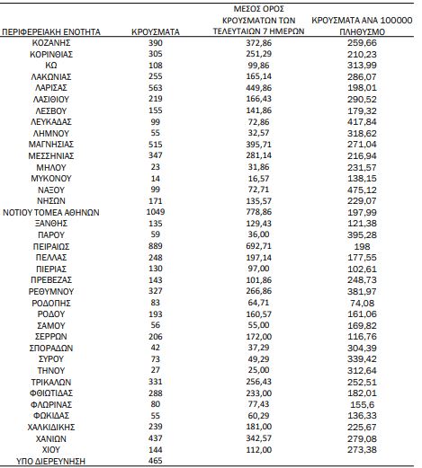 Τα νέα εργαστηριακά επιβεβαιωμένα κρούσματα της νόσου που καταγράφηκαν τις τελευταίες 24 ώρες είναι 23.748, εκ των οποίων 23 εντοπίστηκαν κατόπιν ελέγχων στις πύλες εισόδου της χώρας. Ο συνολικός αριθμός των κρουσμάτων ανέρχεται σε 2.708.610 (ημερήσια μεταβολή +0.9%), εκ των οποίων 49.3% άνδρες. Με βάση τα επιβεβαιωμένα κρούσματα των τελευταίων 7 ημερών, 211 θεωρούνται σχετιζόμενα με ταξίδι από το εξωτερικό και 1.564 είναι σχετιζόμενα με ήδη γνωστό κρούσμα. To ???????? για την επικράτεια βάσει των κρουσμάτων εκτιμάται σε 1.04 (95% ΔΕ: 0.96 – 1.12)