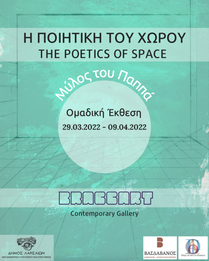 Η γκαλερί σύγχρονης τέχνης Braggart σε συνεργασία με την Αντιδημαρχία Πολιτισμού & Επιστημών Δήμου Λαρισαίων, διοργανώνει στο ισόγειο του Μύλου του Παππά (κεντρικό κτήριο), ομαδική εικαστική έκθεση των συνεργατών της με τίτλο «Η ποιητική του χώρου» / “The poetics of space” από τις 29 Μαρτίου έως τις 9 Απριλίου 2022.