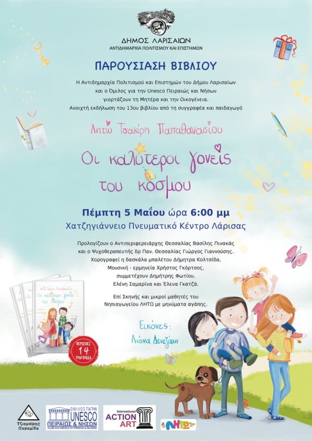 Την Πέμπτη 5 Μαΐου στις 18:00 στο Χατζηγιάννειο Πνευματικό Κέντρο υπό την αιγίδα της Αντιδημαρχίας Πολιτισμού και Επιστημών του Δήμου Λαρισαίων και του Ομίλου Unesco Πειραιώς και Νήσων, θα παρουσιαστεί το νέο βιβλίο της συγγραφέως και παιδαγωγού Λητώς Τσακίρη Παπαθανασίου “Οι Καλύτεροι γονείς του κόσμου” με εικονογράφο την Λιάνα Δενεζάκη, από τις Eκδόσεις Τζιαμπίρης.