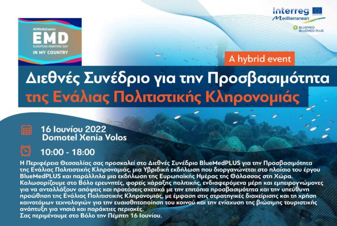 Διεθνές Συνέδριο για την Προσβασιμότητα της Ενάλιας Πολιτιστικής Κληρονομιάς διοργανώνει η Περιφέρεια Θεσσαλίας στο πλαίσιο του έργου «BlueMedPLUS» (https://bluemed.interreg-med.eu/) την Πέμπτη 16 Ιουνίου 2022 από τις 10:00 π.μ. έως τις 18:00 μ.μ. στο Ξενοδοχείο «DOMOTEL XΕNIA» στο Βόλο. Στο συνέδριο αναμένεται να φιλοξενηθούν ερευνητές, υπεύθυνοι χάραξης πολιτικής, ενδιαφερόμενοι φορείς και εμπειρογνώμονες στους διάφορους τομείς που σχετίζονται με την Ενάλια Πολιτιστική Κληρονομιά ώστε να παρουσιάσουν το έργο και τις προτάσεις τους για την προστασία, τη βιώσιμη διαχείριση και την υπεύθυνη προώθησή της. Το πρόγραμμα του συνεδρίου καλύπτει μια σειρά θεμάτων σχετικά με την εφαρμογή της διαχείρισης, στρατηγικές και τη χρήση καινοτόμων τεχνολογιών ως καλών πρακτικών που ενισχύουν την προσβασιμότητα των Ενάλιων Πολιτιστικών Χώρων και ευαισθητοποιούν το κοινό, ενισχύοντας έτσι την αειφόρο τουριστική ανάπτυξη για τα νησιά και τις παράκτιες περιοχές