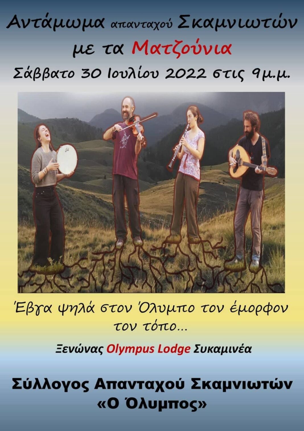 Με όχημα την επιθυμία για αντάμωμα και την ενέργεια από τον Όλυμπο, ο Σύλλογος των Απανταχού Σκαμνιωτών διοργάνωσε με μεγάλη επιτυχία το Σάββατο 30 Ιουλίου 2022 το καθιερωμένο ετήσιο αντάμωμα των Σκαμνιωτών στην καταγωγή αλλά και των φίλων, στο φιλόξενο χώρο του ξενώνα Olympus Lodge, αντάμα με παραδοσιακά τραγούδια και χορούς κυκλωτικούς σε ένα σμίξιμο παλιών και νέων, σε μια γιορτή ζωής.