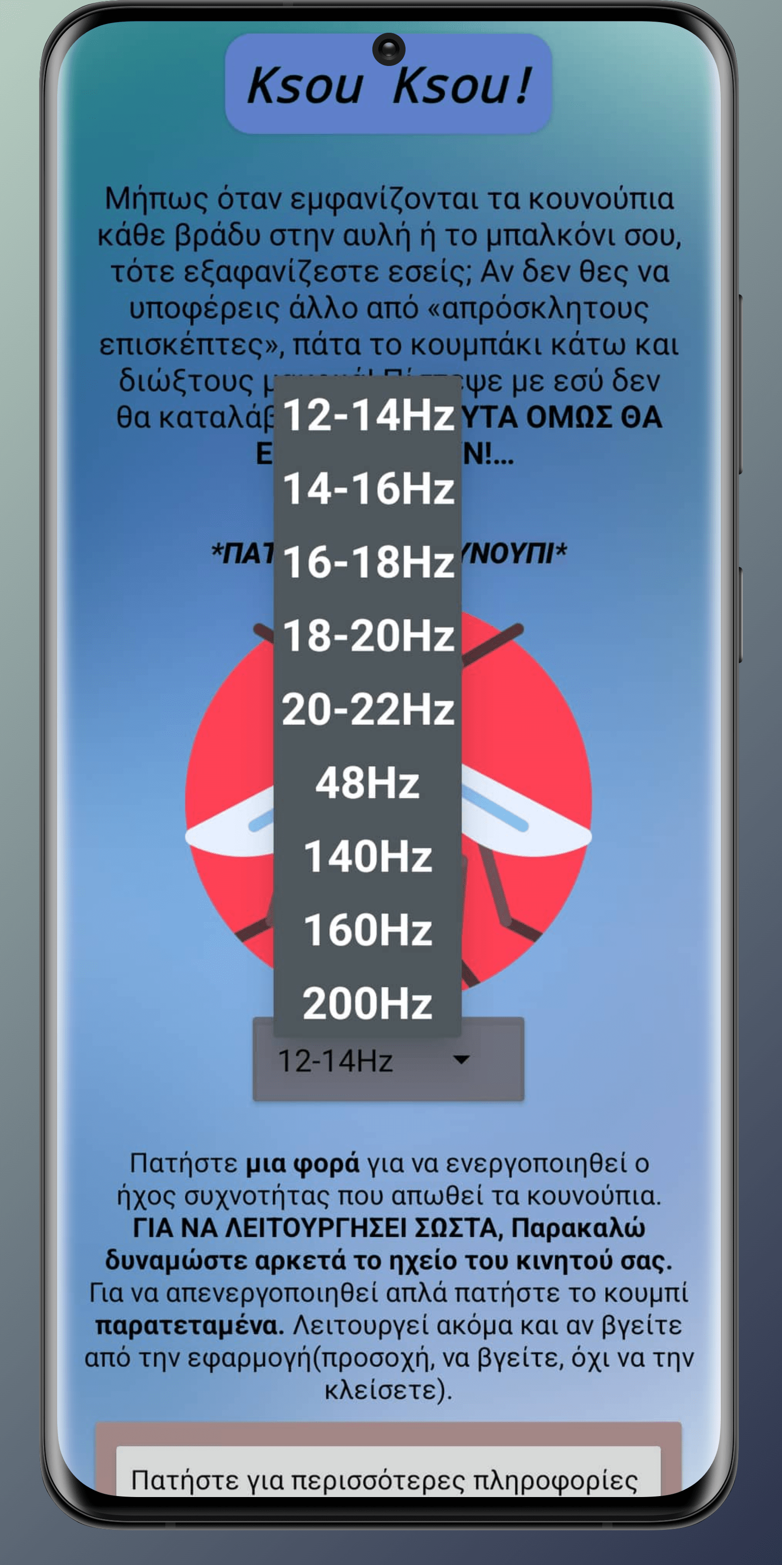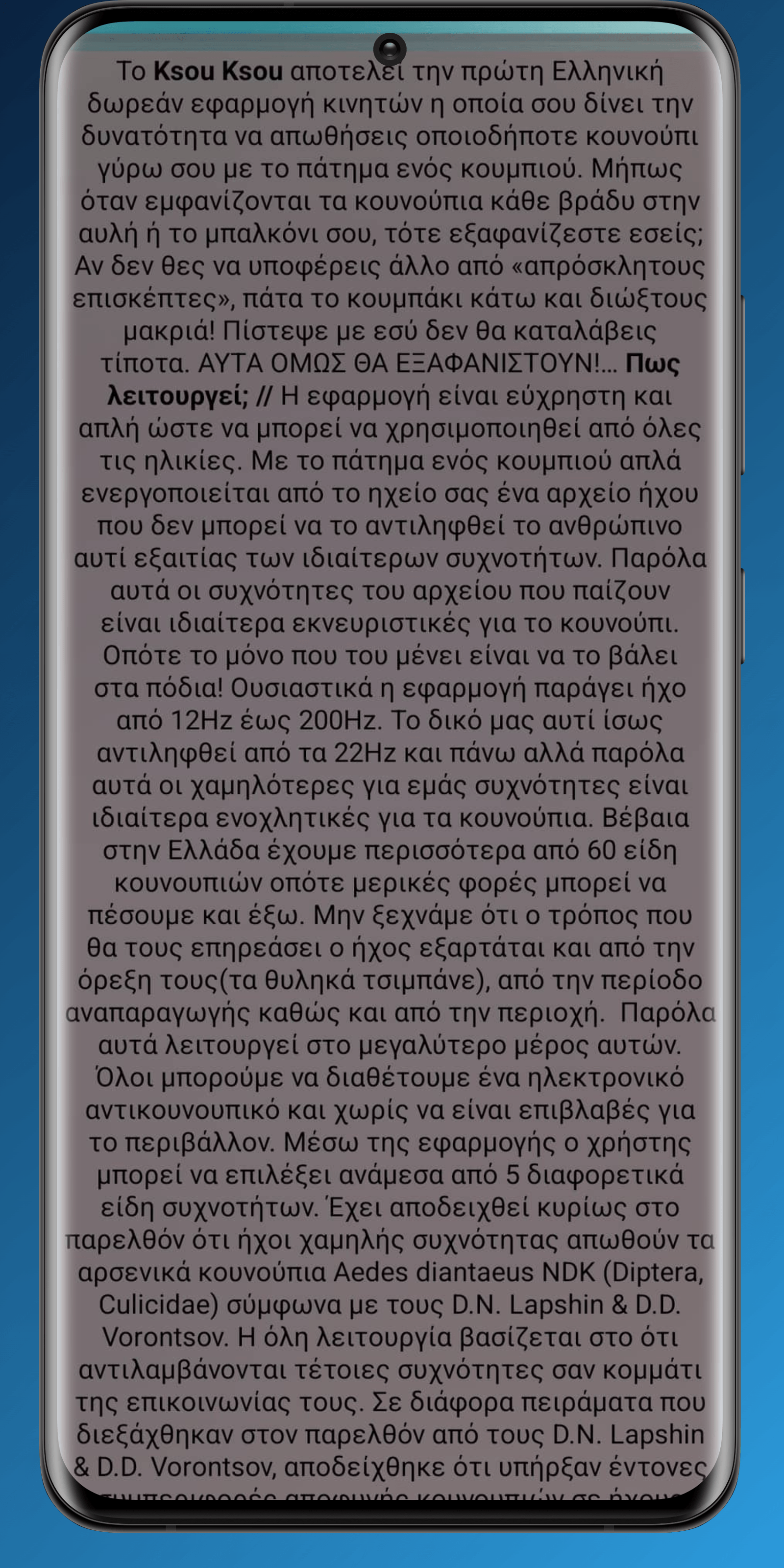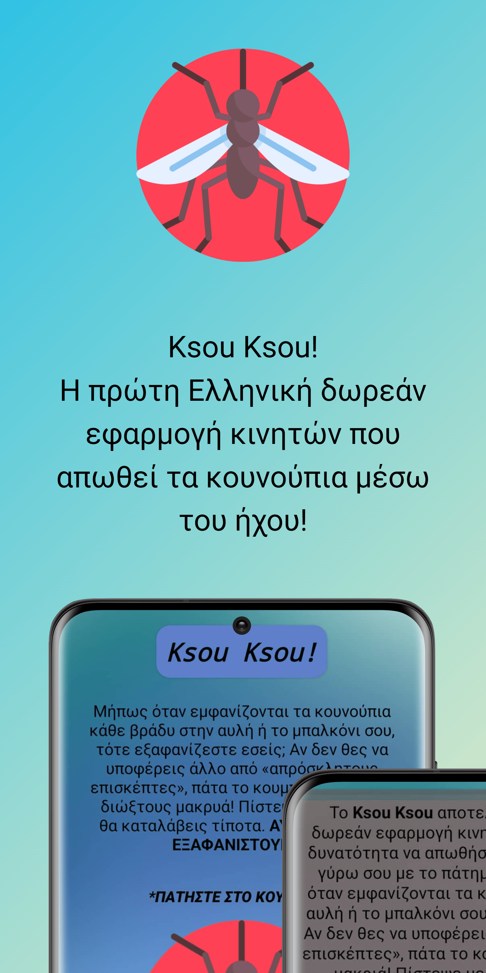 “Το Ksou Ksou αποτελεί την πρώτη Ελληνική δωρεάν εφαρμογή κινητών η οποία σου δίνει την δυνατότητα να απωθήσεις οποιοδήποτε κουνούπιγύρω σου με το πάτημα ενός κουμπιού. Μήπως όταν εμφανίζονται τα κουνούπια κάθε βράδυ στην αυλή ή το μπαλκόνι σου, τότε εξαφανίζεστε εσείς; Αν δεν θες να υποφέρεις άλλο από «απρόσκλητους επισκέπτες», πάτα το κουμπάκι κάτω και διώξε τους μακριά! Εσύ δεν θα καταλάβεις τίποτα. ΑΥΤΑ ΟΜΩΣ ΘΑ ΕΞΑΦΑΝΙΣΤΟΥΝ!…”