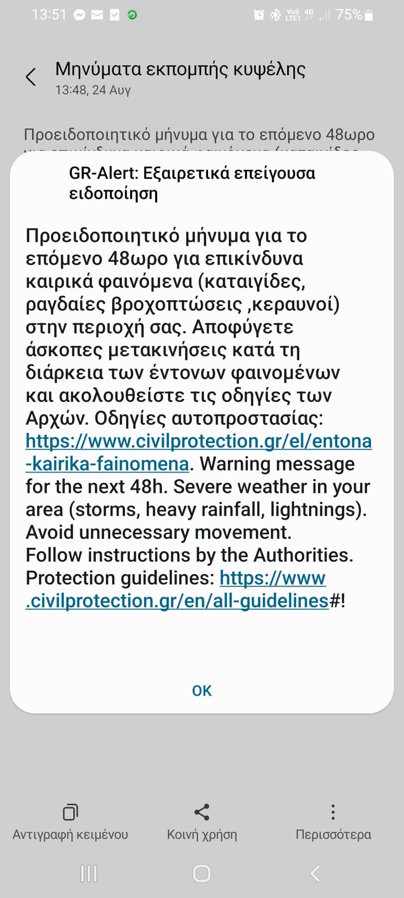 Επείγουσα ειδοποιήση στα κινητά Λαρισαίων εστάλη νωρίς το μεσημέρι της Τετάρτης μέσω της υπηρεσίας 112 της Πολιτικής Προστασίας ενόψει της κακοκαιρίας που επρόκειτο να πλήξει και την περιοχή μας.