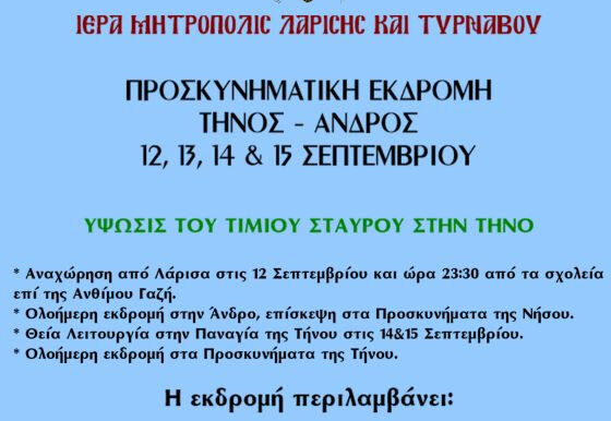 Η Ιερά Μητρόπολη Λαρίσης και Τυρνάβου διοργανώνει προσκυνηματική εκδρομή στην Ιερά Νήσο Τήνο και στο νησί της Άνδρου για την εορτή της Υψώσεως του Τιμίου και Ζωοποιού Σταυρού, με επικεφαλής τον Σεβασμιώτατο Μητροπολίτη Λαρίσης και Τυρνάβου κ. Ιερώνυμο. Για εγγραφές μπορείτε να απευθύνεστε στα Γραφεία της Ιεράς Μητροπόλεως και ώρες πρωινές από 09:00-14:00 και στο τηλέφωνο 2410617685.