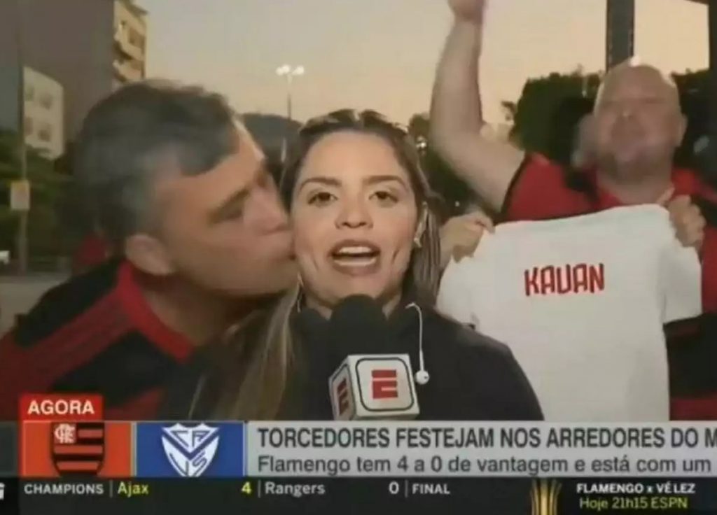 Συγκεκριμένα, η ρεπόρτερ του ESPN βγήκε σε ζωντανή σύνδεση, καλύπτοντας το πανηγυρικό κλίμα που επικρατούσε στις τάξεις των οπαδών της Φλαμένγκο, όταν ένας οπαδός τη φίλησε στο μάγουλο.