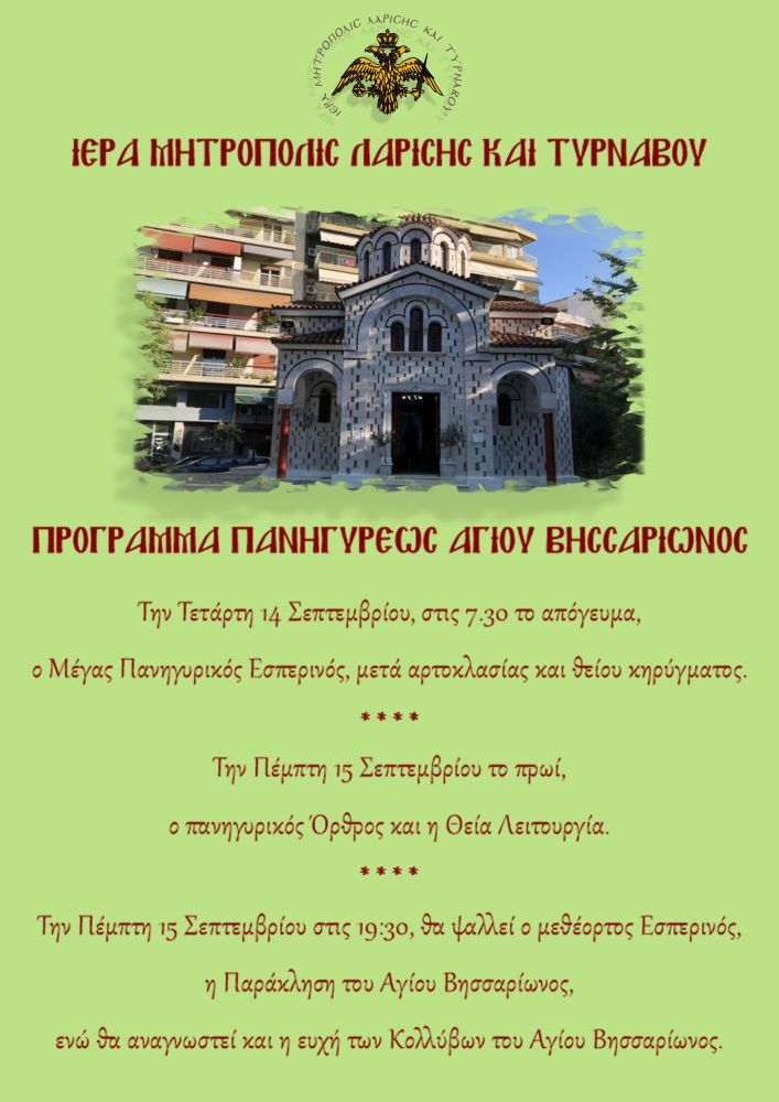 Την Τετάρτη 14 Σεπτεμβρίου 2022 πανηγυρίζει στις 7:30 το απόγευμα το εκκλησάκι του Αγίου Βησσαρίωνα, θα τελεστεί ο Μέγας Πανηγυρικός Εσπερινός, μετά αρτοκλασίας και θείου κηρύγματος. Την Πέμπτη 15 Σεπτεμβρίου 2022 το πρωί ο πανηγυρικός όρθρος και η Θεία Λειουργία. Την Πέμπτη το απόγευμα θα ψαλλεί ο μεθέορτος Εσπερινός, η Παράκληση του Αγίου Βησσαρίωνος, ενώ θα αναγωνωστεί η ευχή των Κολλύβων του Αγίου Βησσαρίωνος.