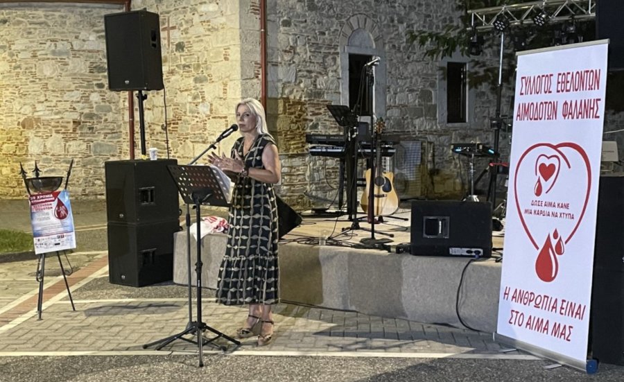 Η κ. Καραλαριώτου συνεχάρη αρχικά τους διοργανωτές, τον Σύλλογο Εθελοντών Αιμοδοτών Φαλάνης ,την Προέδρο Ειρήνη Μάνη , τον Αντιπρόεδρο Ρένο Καρυώτη και όλα τα μέλη του ΔΣ , την Πανελλήνια Ομοσπονδία Συλλόγων Εθελoντών Αιμοδοτών (ΠΟΣΕΑ) , τον Προέδρο της κοινότητας Κώστα Λυγούρα για την αξιέπαινη πρωτοβουλία τους, καθώς και τον πολυετή αγώνα τους να ενημερώσουν και να ευαισθητοποιήσουν ολοένα και περισσότερους Αιμοδότες και σημείωσε: Οι Σύλλογοι Αιμοδοτών επιτελούν έναν ιερό σκοπό. Ελπίζω η έντονη παρουσία μας σήμερα στη Φαλάνη, να τους δώσει δύναμη και διάθεση να συνεχίσουν το πολύτιμο έργο τους».