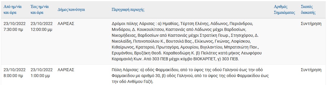 -Από ώρα 07:30 – 12:00: Δρόμοι πόλης Λάρισας: α) Ημαθίας, Τέρτση Ελένης, Λάδωνος, Περιάνδρου, Μινδάρου, Δ. Κουκουλίτσου, Καστανιάς από Λάδωνος μέχρι Βαρδοσίων, Νικομήδειας, Βαρδοσίων από Καστανιάς μέχρι Στρατίκη Γεωρ., Στησιχόρου, Δ. Νικολαϊδη, Πιπινοπούλου Κ. , Βουτσιλά Βασ., Ελίκωνος, Γκώνας, Λοφίσκου, Κιθαίρωνος, Κρατερού, Πρωταγόρα, Αμουρίου, Βιγιλαντίου, Μπρατσιώτη Παν., Ερυμάνθου, Βρυζάκη Θεοδ. Καραθεοδώρη Κ. β) Πελάτες κατά μήκος Λεωφόρου Καραμανλή Κων. Από 303 ΠΕΒ μέχρι κόμβο ΒΙΟΚΑΡΠΕΤ, γ) 303 ΠΕΒ.