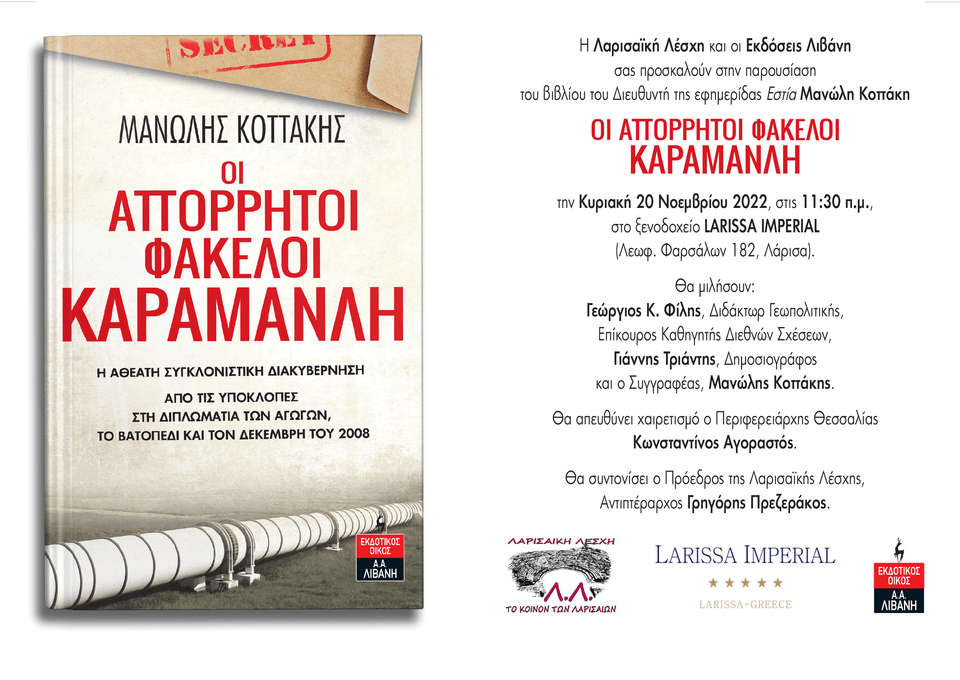 Η Λαρισαϊκή Λέσχη και οι Εκδόσεις Λιβάνη διοργανώνουν την παρουσίαση του βιβλίου του Διευθυντή της εφημερίδας Eστία Μανώλη Κοττάκη “ΟΙ ΑΠΟΡΡΗΤΟΙ ΦΑΚΕΛΟΙ ΚΑΡΑΜΑΝΛΗ”, την Κυριακή 20 Νοεμβρίου 2022, στις 11:30 π.μ., στο ξενοδοχείο LARISSA IMPERIAL Φαρσάλων 182, Λάρισα