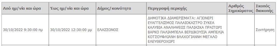 Σε προγραμματισμένες διακοπές ρεύματος προχωρά ο ΔΕΔΔΗΕ Α.Ε. σήμερα Κυριακή 30 Οκτωβρίου, στην περιοχή της Ελασσόνας, για να εκτελεσθούν απαραίτητες τεχνικές εργασίες στο δίκτυο.