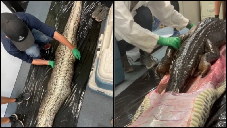 Έκπληκτοι έμειναν κάτοικοι της Φλόριντα των ΗΠΑ που σκότωσαν έναν βιρμανικό πύθωνα. Όταν άνοιξαν το σώμα του τεράστιου φιδιού βρήκαν μέσα σε αυτό έναν ολόκληρο αλιγάτορα μήκους 1,5 μέτρου.