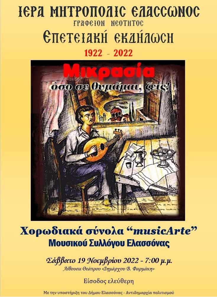 Επιθυμώντας η Ιερά Μητρόπολη να τιμήσει τα 100 χρόνια από την Μικρασιατική Καταστροφή, αλλά και τους χορωδούς για την συμμετοχή τους στην συναυλία του Καλλιμάρμαρου Σταδίου Αθηνών, διοργανώνει το προσεχές Σάββατο 19 Νοεμβρίου ε.ε. στην αίθουσα