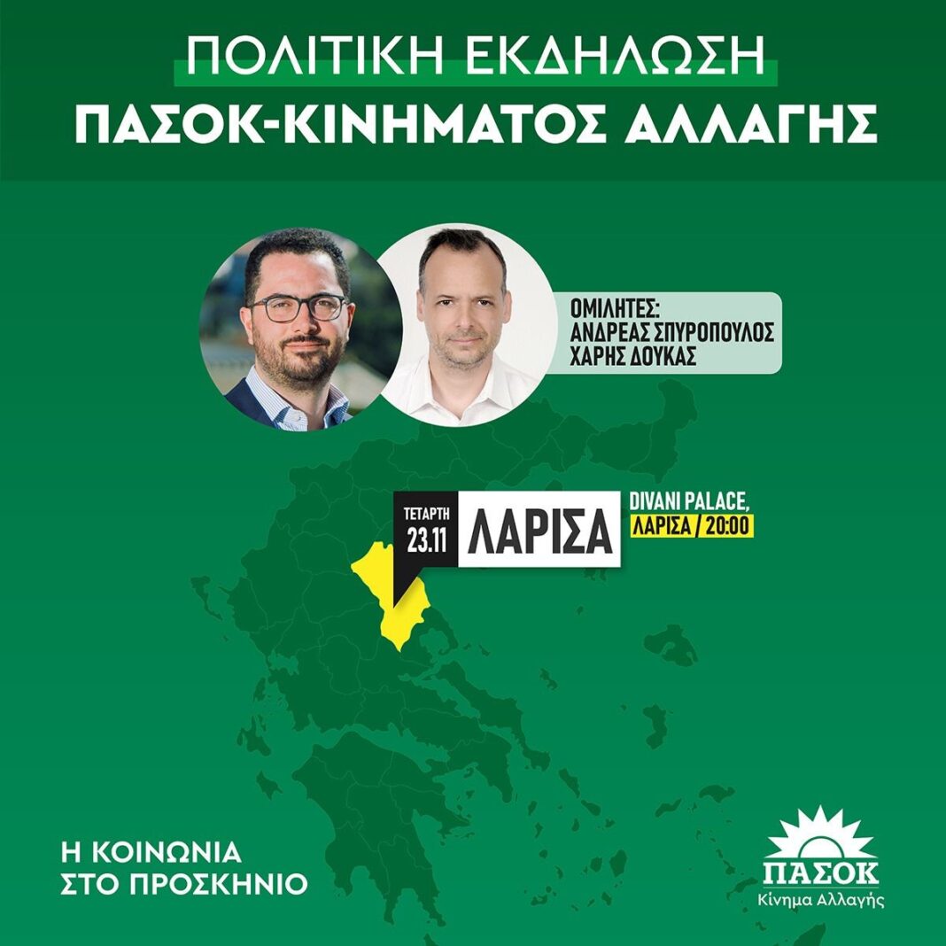 Πολιτική εκδήλωση διοργανώνει η Νομαρχιακή Επιτροπή Λάρισας του ΠΑΣΟΚ – Κινήματος Αλλαγής, την Τετάρτη 23 Νοεμβρίου στις 20:00, στο ξενοδοχείο Divani, με κεντρικό ομιλητή το γραμματέα της Κεντρικής Πολιτικής Επιτροπής Ανδρέα Σπυρόπουλο, ο οποίος και θα αναλύσει τη γενικότερη πολιτική επικαιρότητα . Στην εκδήλωση θα συμμετέχει επίσης ο αναπληρωτής καθηγητής Ενεργειακής και Περιβαλλοντικής Πολιτικής και Διαχείρισης στο ΕΜΠ, τομεάρχης Ενέργειας, Χάρης Δούκας, ο οποίος θα μιλήσει για το θέμα της ενεργειακής κρίσης.