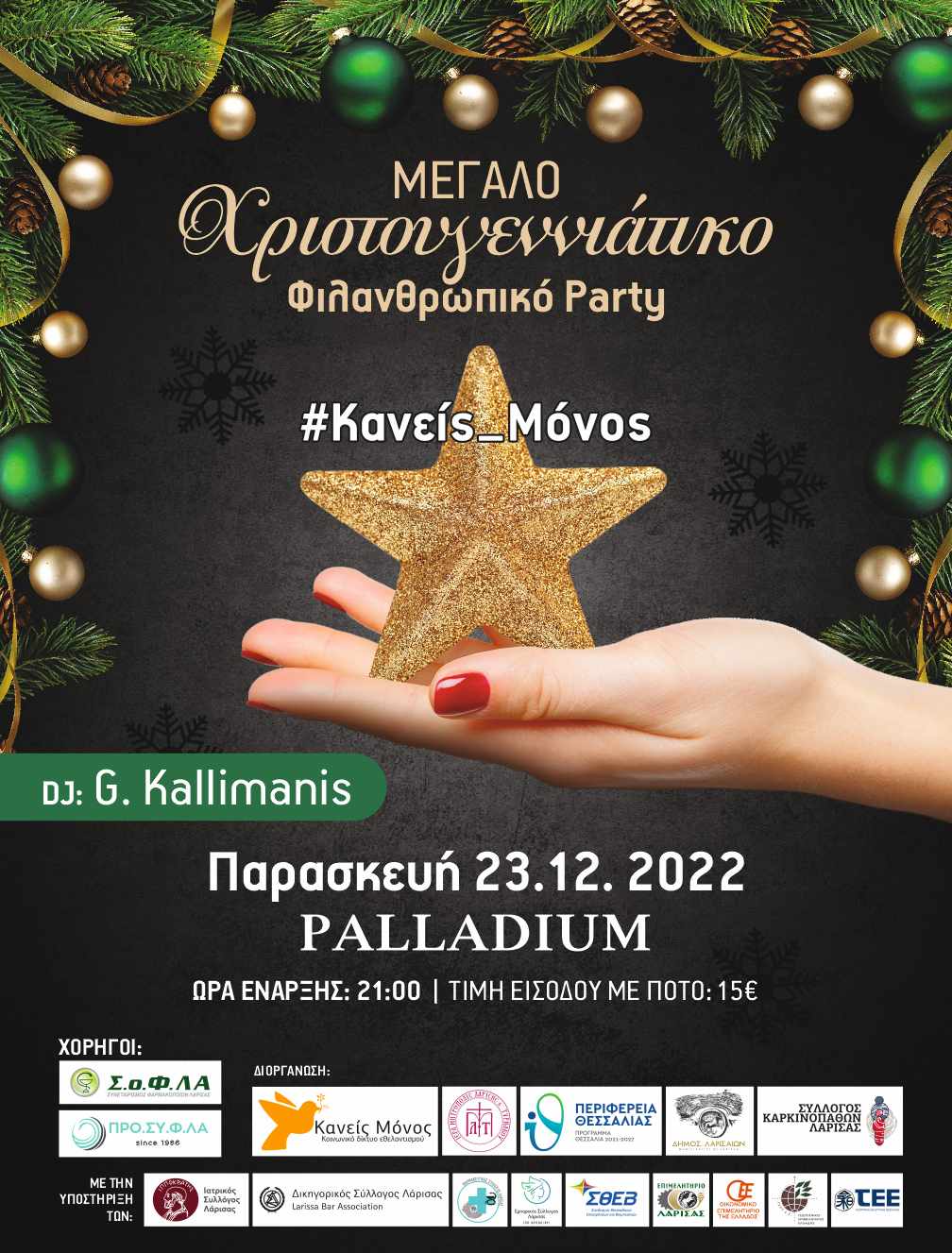 Με πρωτοβουλία του Κοινωνικού Εθελοντικού Δικτύου #Κανείς Μόνος», συνδιοργανωτές, την Ιερά Μητρόπολη Λαρίσης & Τυρνάβου, την Περιφέρεια Θεσσαλίας, τον Δήμο Λαρισαίων, τον Σύλλογο Καρκινοπαθών ν.Λάρισας και τη στήριξη των φορέων της πόλης, του Ιατρικού Συλλόγου Λάρισας, του Φαρμακευτικού Συλλόγου, του Δικηγορικού Συλλόγου , του Εμπορικού Συλλόγου, του ΣΘΕΒ, των Επιμελητηρίων και χορηγούς επικοινωνίας τα Μέσα Μαζικής Ενημέρωσης της περιοχής, θα πραγματοποιηθεί μια ξεχωριστή Χριστουγεννιάτικη εκδήλωση Αλληλεγγύης, αύριο Παρασκευή 23 Δεκεμβρίου και ώρα 21.00, στο «Palladium»