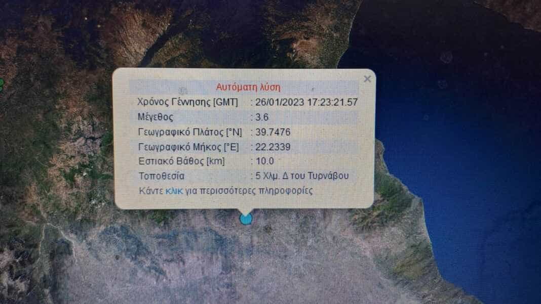 Σύμφωνα με τις πρώτες πληροφορίες από το Γεωδυναμικό Ινστιτούτο η δόνηση έλαβε χώρα στις 19.23 και ήταν μεγέθους 3,6 βαθμών της κλίμακας Ρίχτερ με επίκεντρο 5 χλμ δυτικά του Τυρνάβου