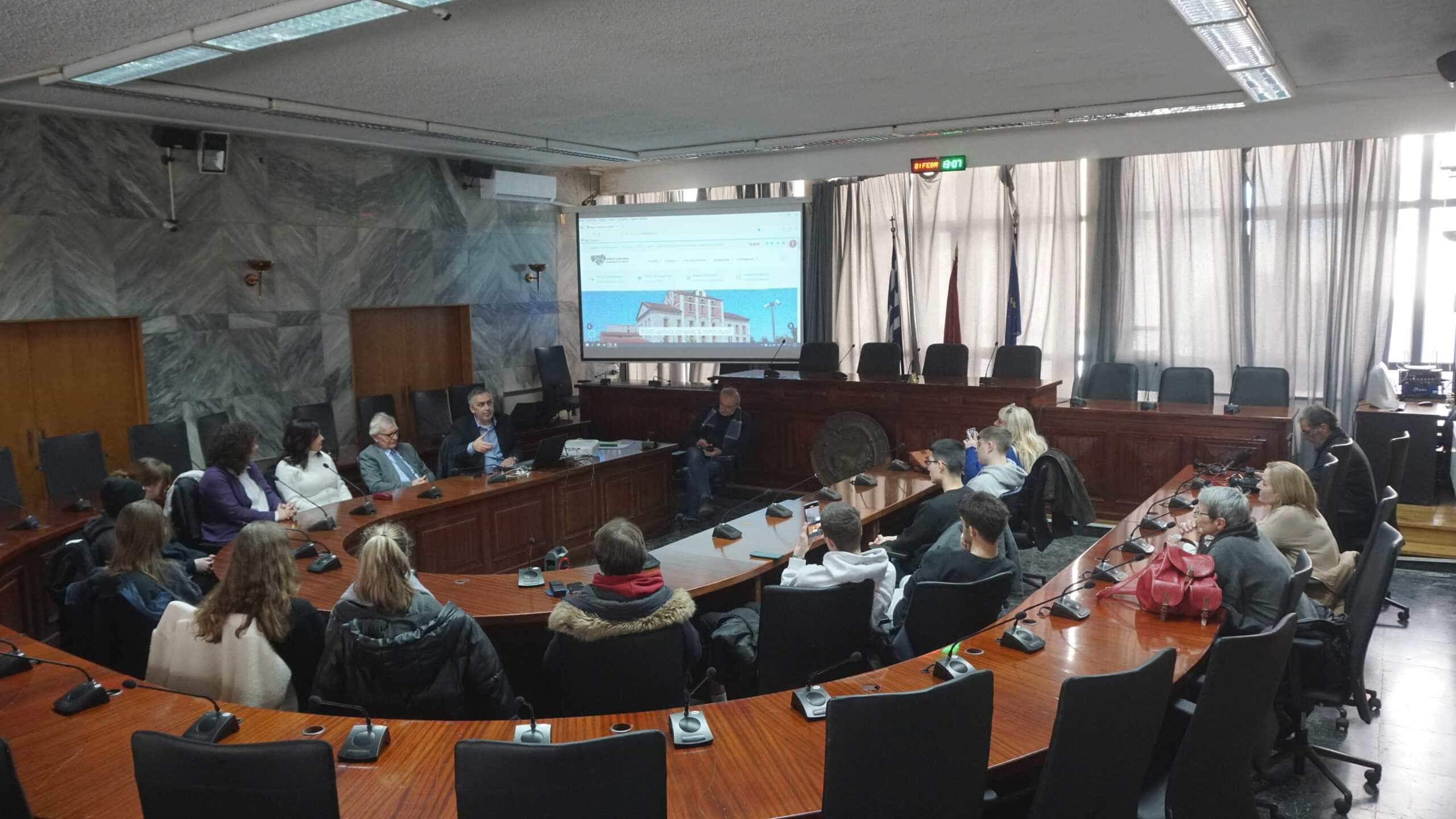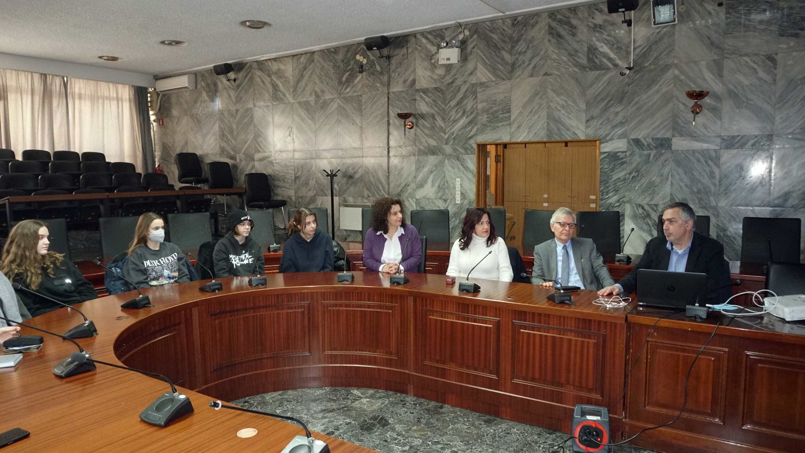 Στην συνάντηση που πραγματοποιήθηκε στην αίθουσα του Δημοτικού Συμβουλίου της Λάρισας, μαθητές και εκπαιδευτικοί συζήτησαν με τον Πρόεδρο του Δημοτικού Συμβουλίου κ. Δημ. Τάχο, τον Αντιδήμαρχο Βιώσιμης Κινητικότητας και Συστημάτων Έξυπνης Πόλης κ. Κων. Διαμάντο και τον Αντιδήμαρχο Διοίκησης, Παιδείας και Δια Βίου Μάθησης κ. Δημ. Δεληγιάννη.