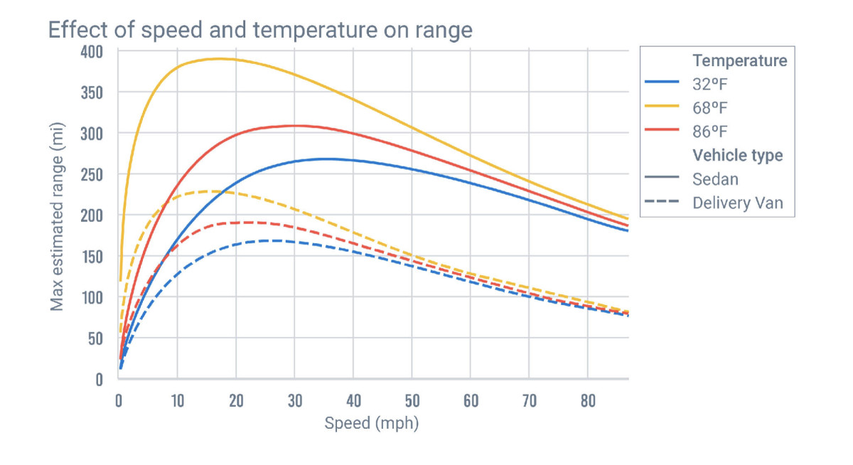 Ανάλυση της εταιρείας Geotab δείχνει ότι η θερμοκρασία έχει πολύ μεγαλύτερη επίδραση στις χαμηλές παρά στις υψηλές ταχύτητες. Αποκαλύπτουν επίσης ότι τα ελαφρά επαγγελματικά οχήματα (van) χάνουν εμβέλεια πολύ πιο γρήγορα από τα αυτοκίνητα στις υψηλές ταχύτητες, κυρίως λόγω του βάρους και του όγκου τους.
