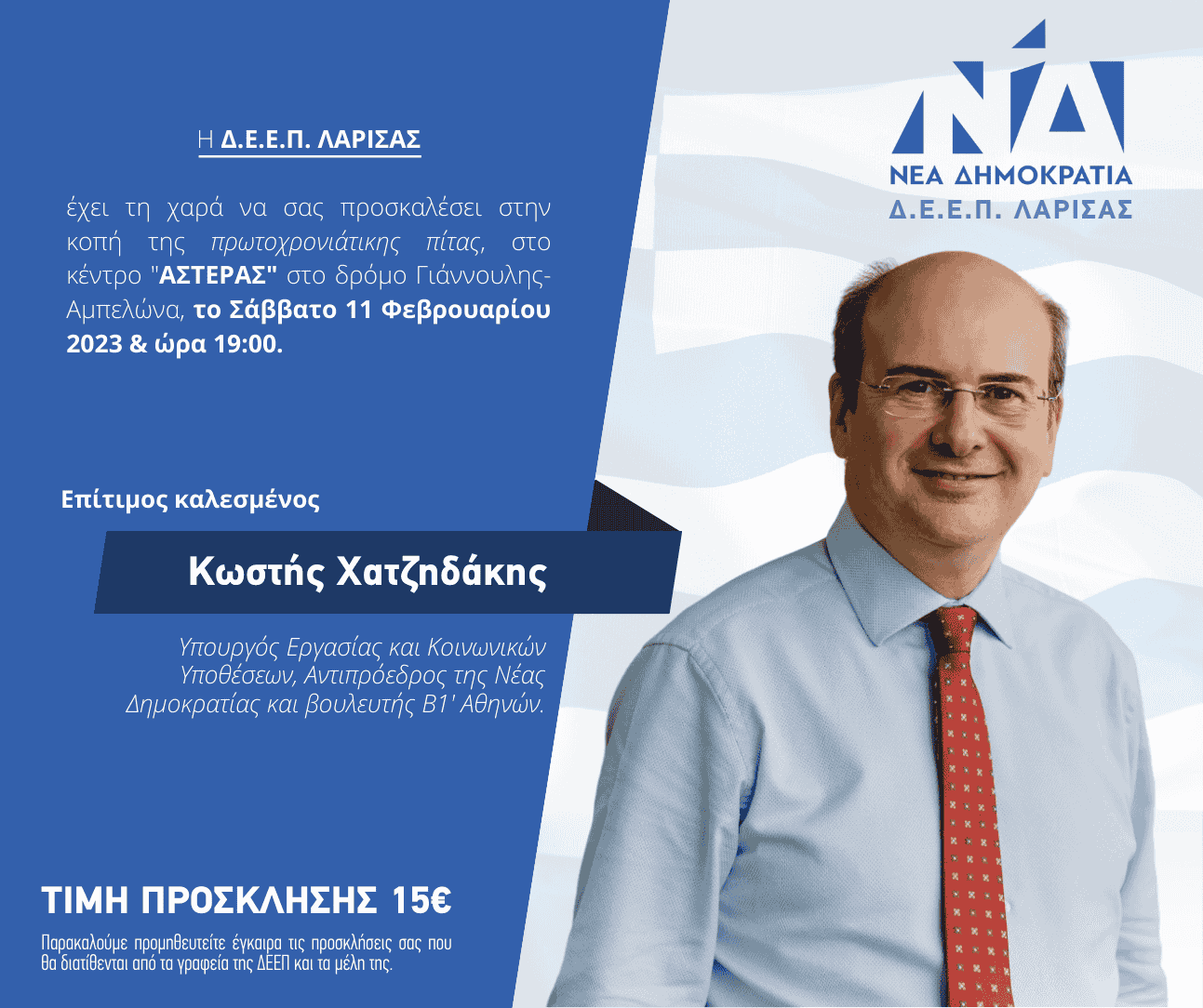 Η Δ.Ε.Ε.Π. Λάρισας Νέας Δημοκρατίας, διοργανώνει εκδήλωση για την κοπή της πρωτοχρονιάτικης πίτας, το Σάββατο 11 Φεβρουαρίου 2023, στο κτήμα «ΑΣΤΕΡΑΣ» στις 7.00 μ.μ.