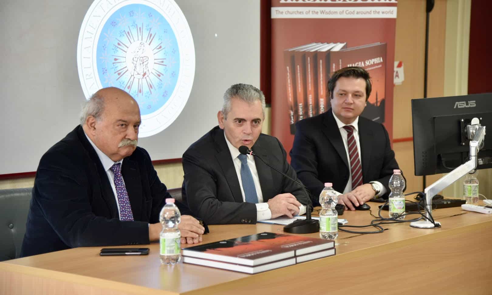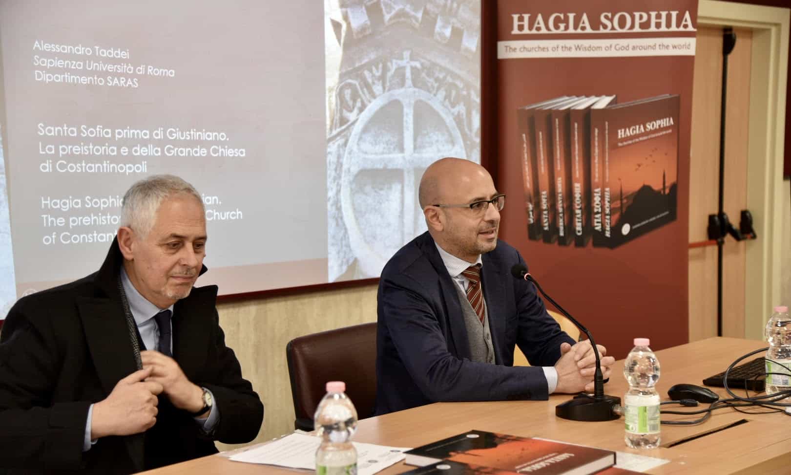 πραγματοποιήθηκε στο πανεπιστήμιο La Sapienza της Ρώμης. Εξαιρετικές εισηγήσεις ανέπτυξαν οι καθηγητές κ. Antonio Lacobini με θέμα «Η Αγία Σοφία του Ιουστινιανού. Ένα θαυμαστό αιώνιο μνημείο», και κ. Alessandro Taddei με θέμα «Η Αγία Σοφία πριν από τον Ιουστινιανό. Η προϊστορία της Μεγάλης Εκκλησίας της Κωνσταντινούπολης». Χαιρετισμό απηύθηναν η κοσμήτορας της Φιλοσοφικής Σχολής και Λογοτεχνίας, κ. Arianna Punzi, ο Διευθυντής του Τμήματος Ιστορίας Ανθρωπολογίας, Θρησκειών, Τέχνων και Θεάματος, καθηγητής κ. Gaetano Lettieri, ενώ την παρουσίαση συντόνισε ο αναπληρωτής καθηγητής Νεοελληνικής Γλώσσας και Λογοτεχνίας του Πανεπιστημίου Sapienza, κ. Χρήστος Μπιντούνης.