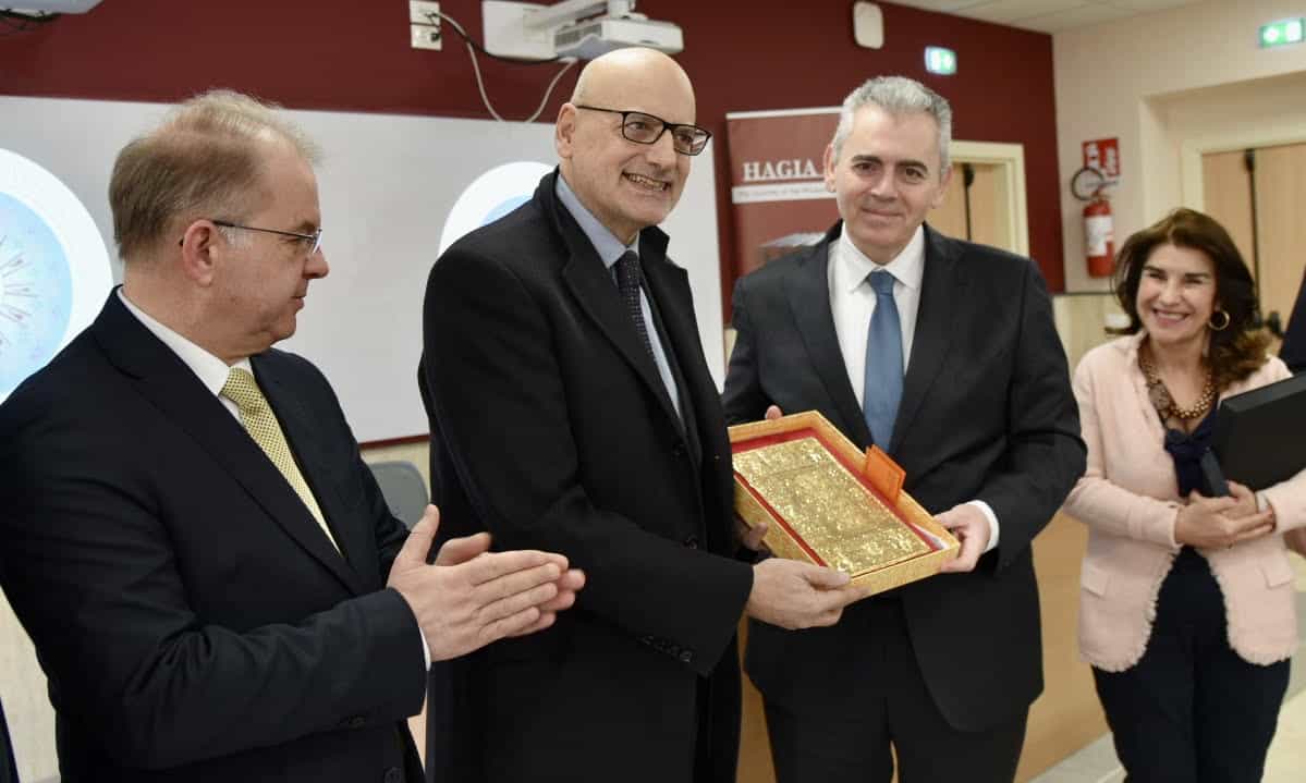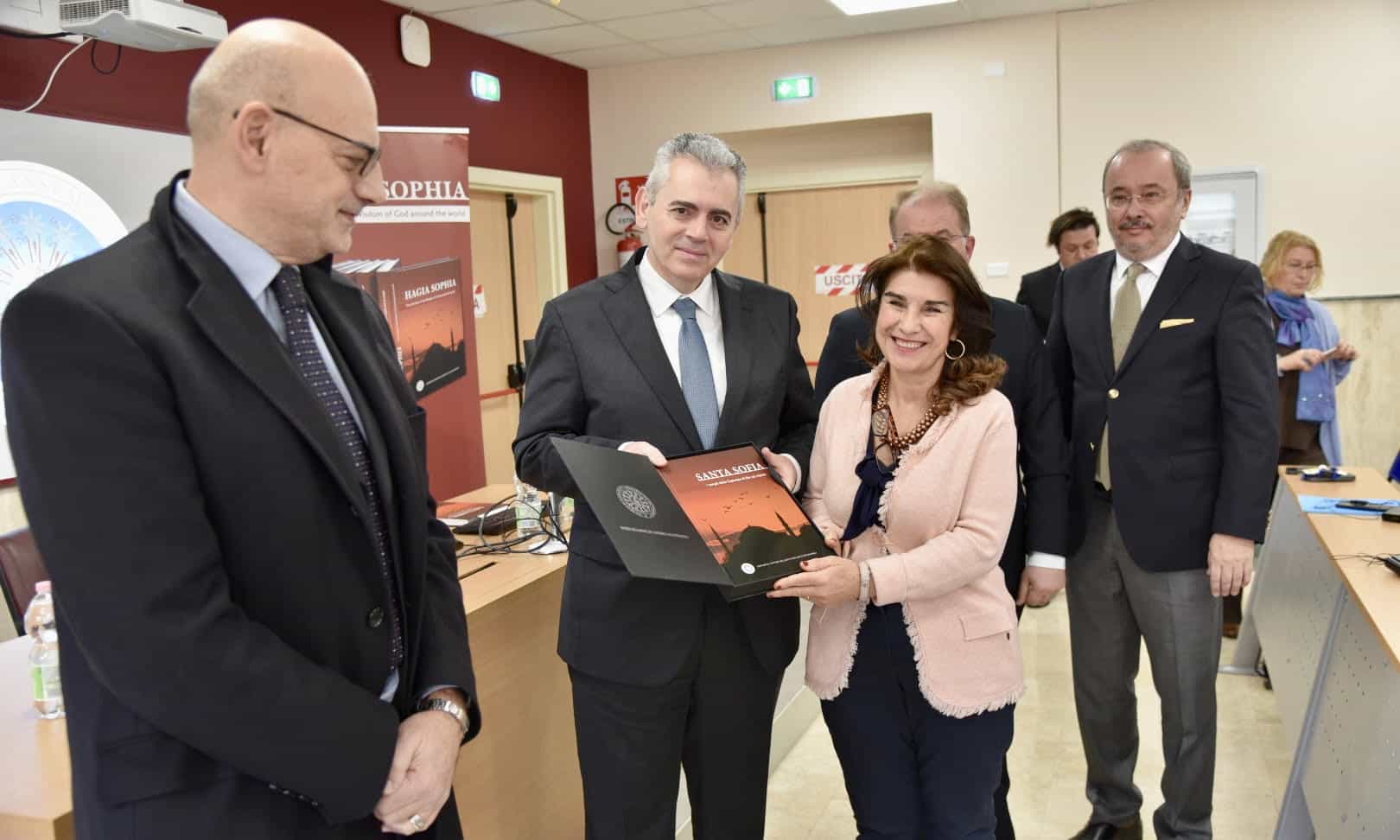 Ο επικεφαλής της ΔΣΟ επιδίδει τον τόμο για τις Αγίες Σοφίες στην κοσμήτορα του πανεπιστημίου της Ρώμης