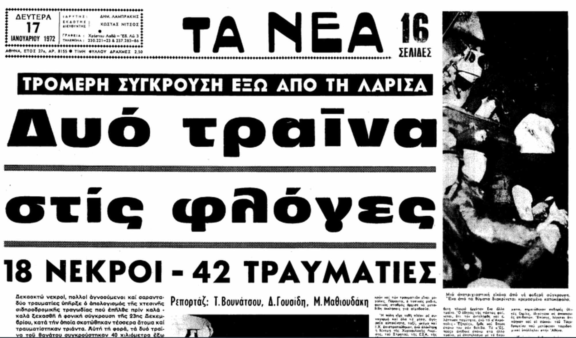 “Τα δύο τρένα του θανάτου συγκρούστηκαν έξω από τη Λάρισα, στη θέση Δοξαρά, στα νότια της πόλεως”, μετέδιδαν την επομένη, Δευτέρα 17 Ιανουαρίου 1972, Τα Νέα. “Αίτια της συγκρούσεως, που συνοδεύτηκε από έκρηξη και πυρκαγιά: Ένας από τους σταθμάρχες Δοξαρά και Ορφανών έδωσε εσφαλμένο σήμα εκκινήσεως. Έτσι οι δύο αμαξοστοιχίες ρίχτηκαν η μία στην άλλη και ακολούθησε μια αληθινή κόλαση θανάτου και τρόμου”. Σύμφωνα με Τα Νέα, επί τόπου σκοτώθηκαν “οι τρεις μηχανοδηγοί, ο θερμαστής και 14 επιβάτες της κοινής αμαξοστοιχίας (σσ, της πόστας)”, ενώ δεν υπήρξε νεκρός από την αμαξοστοιχία Ακρόπολις Εξπρές. “Το έργο της διασώσεως των κινδυνευόντων και της περιθάλψεως των τραυματιών ήταν τρομερά δύσκολο, λόγω των άθλιων καιρικών συνθηκών και της νύχτας που δεν άργησε να επέλθει. Χιόνι, αέρας, παγωνιά, σκοτάδι και απερίγραπτη σύγχυση.” Οι φλόγες από την φωτιά που προκάλεσε η σύγκρουση “φαίνονταν από πέντε χιλιόμετρα μακριά” δίνοντας την εικόνα “ηφαιστείου που μόλις έχει εκραγεί”, έγραφε η εφημερίδα.