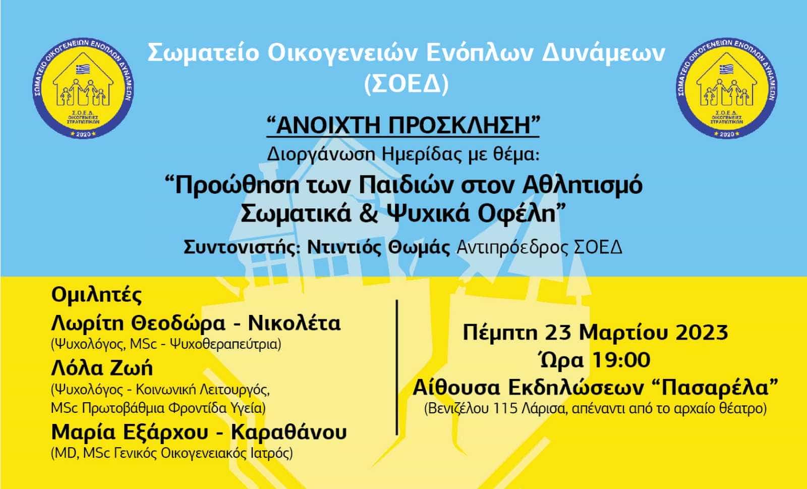 Σε συνέχεια των δράσεων του Σωματείου Οικογενειών Ενόπλων Δυνάμεων (ΣΟΕΔ), τα μέλη του ΔΣ διοργανώνουν ακόμα μία ενημερωτική ημερίδα στη Λάρισα με θέμα την “Προώθηση των Παιδιών στον Αθλητισμό, Σωματικά και Ψυχικά Οφέλη”.