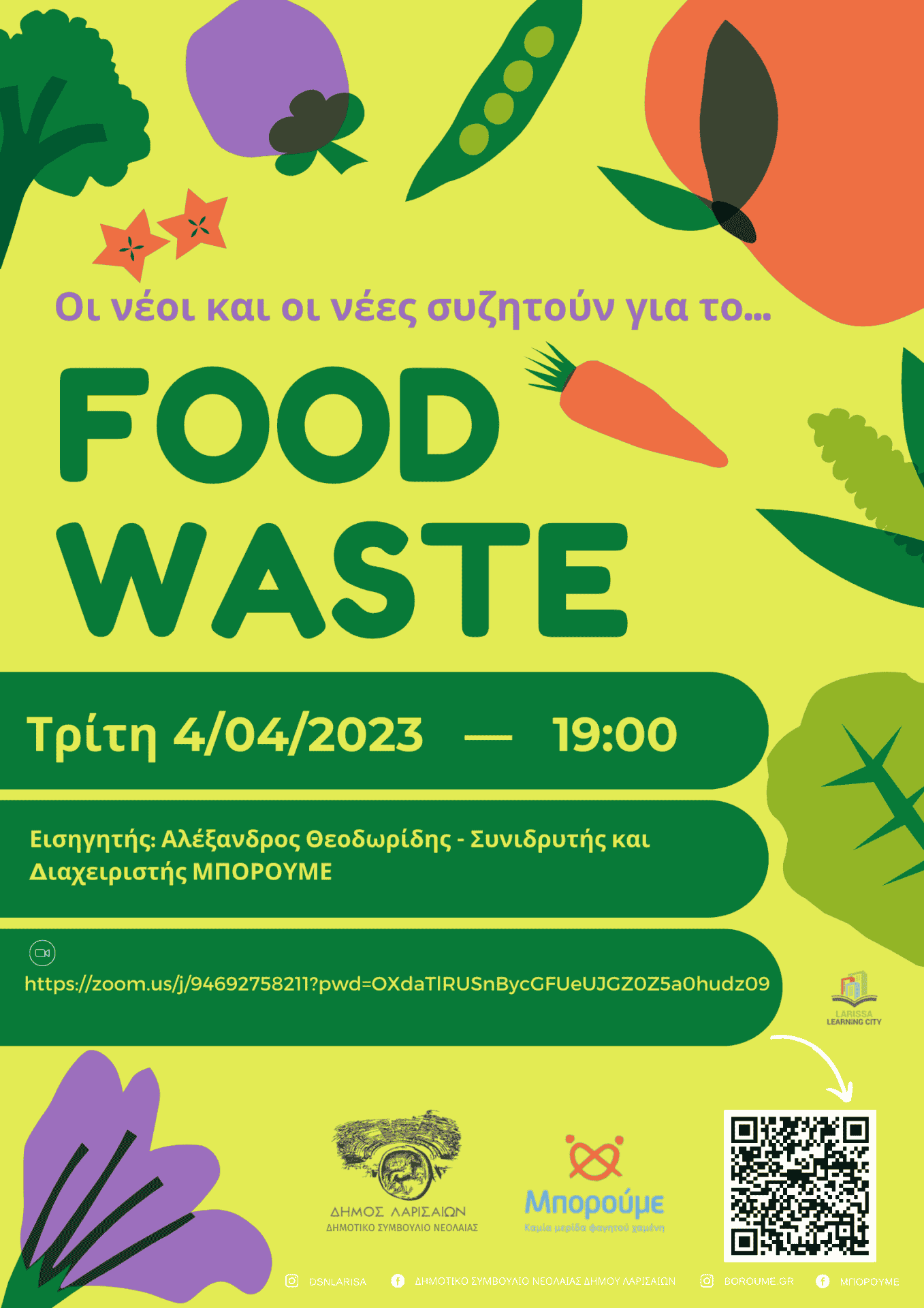 Την Τρίτη 4 Απριλίου και ώρα 19:00 θα πραγματοποιηθεί ημερίδα σχετικά με το FOOD WASTE, την οποία και διοργανώνει το Δημοτικό Συμβούλιο Νεολαίας του Δήμου Λαρισαίων σε συνεργασία με το ΜΠΟΡΟΥΜΕ.