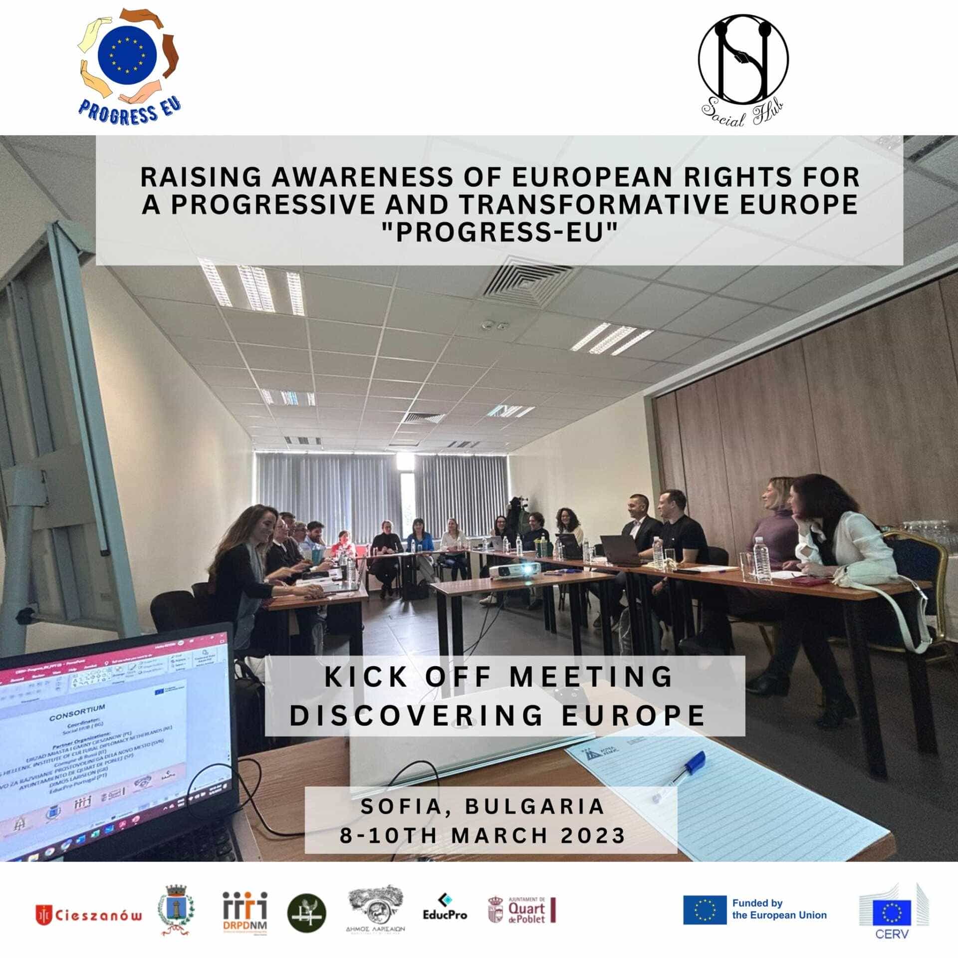 Πραγματοποιήθηκε στις 8-10 Μαρτίου 2023 στη Σόφια στη Βουλγαρία η εναρκτήρια διακρατική συνάντηση του προγράμματος “PROGRESS_EU: Raising awareness of European rights for a progressive and transformative Europe” του προγράμματος «Citizens, Equality, Rights and Values Programme (CERV)» στο οποίο συμμετέχει ως εταίρος και ο Δήμος Λαρισαίων.