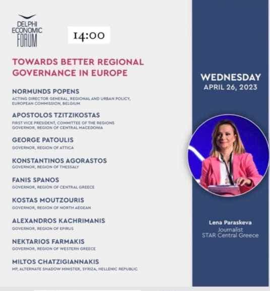 Στο 8 ο Οικονομικό Φόρουμ των Δελφών (Delphi Economic Forum VIII) με τίτλο «Paradigm Shifts» μιλά ο Περιφερειάρχης Θεσσαλίας κ. Κώστας Αγοραστός σήμερα Τετάρτη 26 Απριλίου και ώρα 14:00 (Ianthi Room/ Amalia Hotel). Ο κ. Αγοραστός συμμετέχει στη συζήτηση: «Towards Better Regional Governance In Europe» (Προς μια καλύτερη Περιφερειακή Διακυβέρνηση στην Ευρώπη).