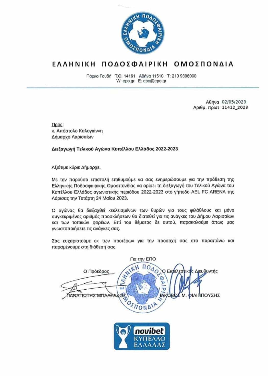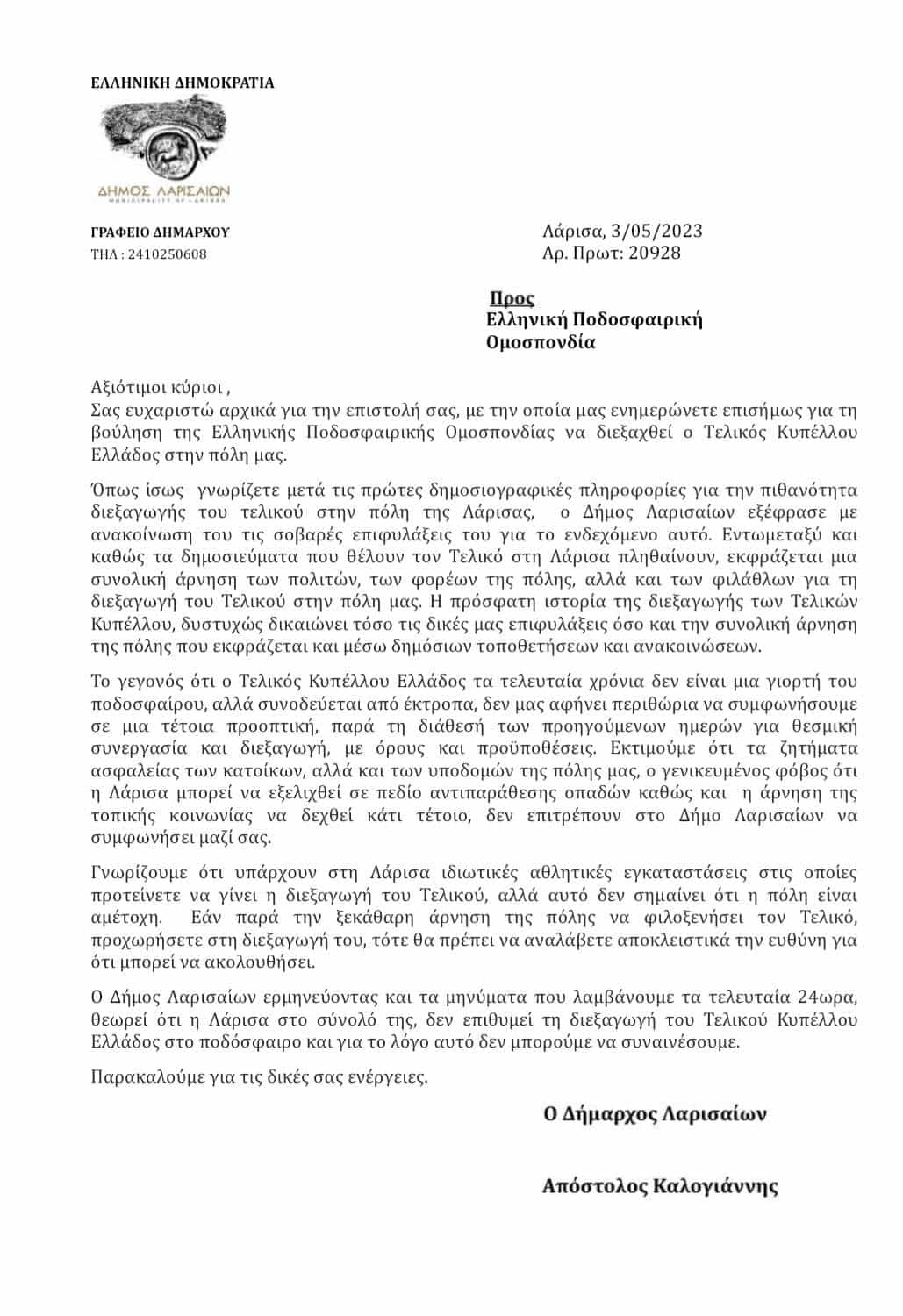 Την κατηγορηματική αντίθεση του Δήμου Λαρισαίων στη διεξαγωγή του Τελικού του Κυπέλου Ελλάδας, στην πόλη της Λάρισας, ακόμα και εάν αυτό διεξαχθεί, κεκλεισμένων των θυρών και μόνο με την διανομή προσκλήσεων, εκφράζει ο δήμαρχος Λαρισαίων Απόστολος Καλογιάννης σε απαντητική επιστολή του προς τον πρόεδρο τη ΕΠΟ κ. Παν. Μπαλτάκο και τον εκτελεστικό διευθυντή της Ομοσπονδίας κ. Ιακ. Φιλιππούση.