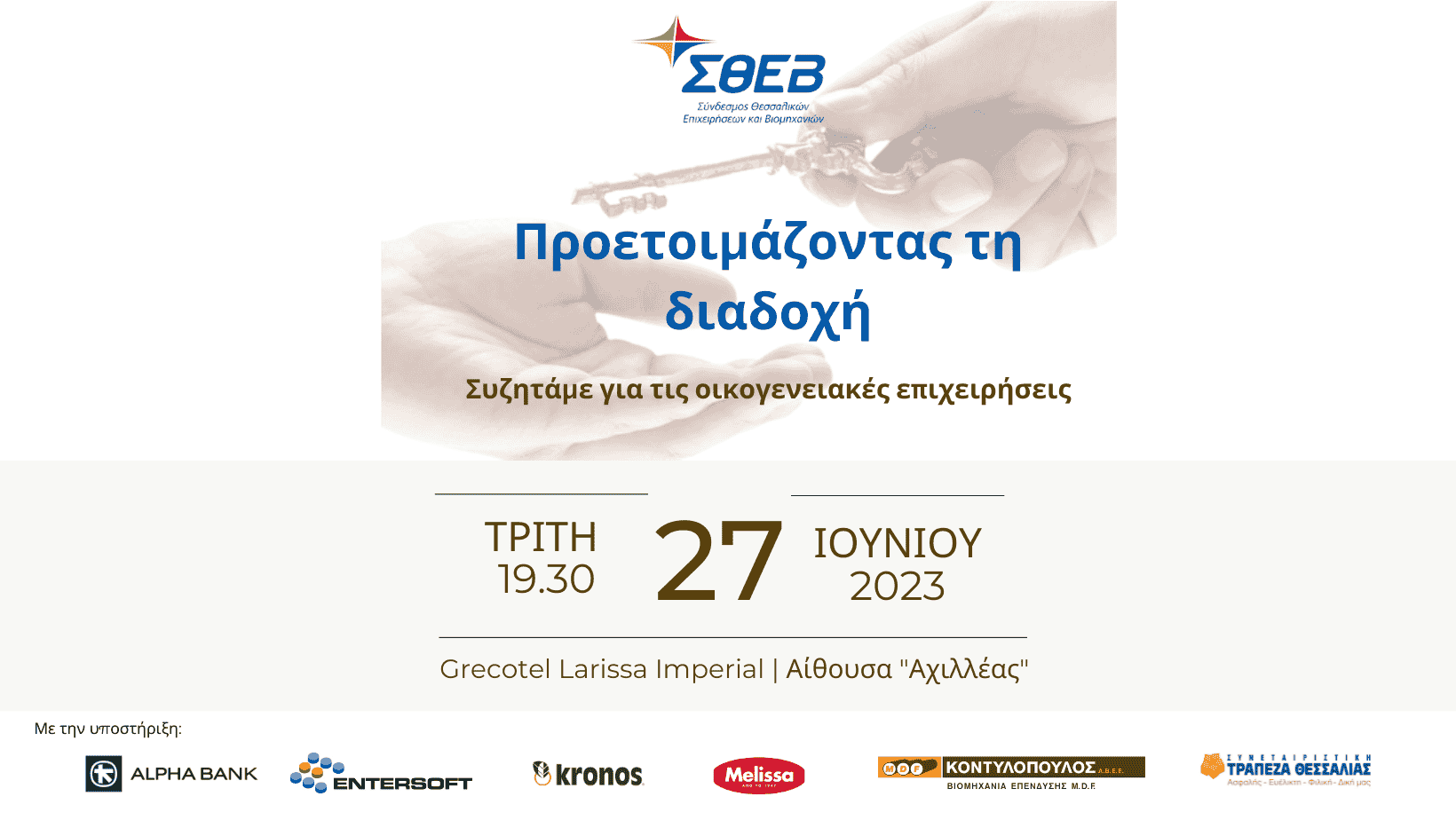 «Προετοιμάζοντας τη διαδοχή», διοργανώνει ανοικτή συζήτηση για τις οικογενειακές επιχειρήσεις, σήμερα Τρίτη 27 Ιουνίου και ώρα 19.30 στη Λάρισα, στο Ξενοδοχείο «Larissa imperial».