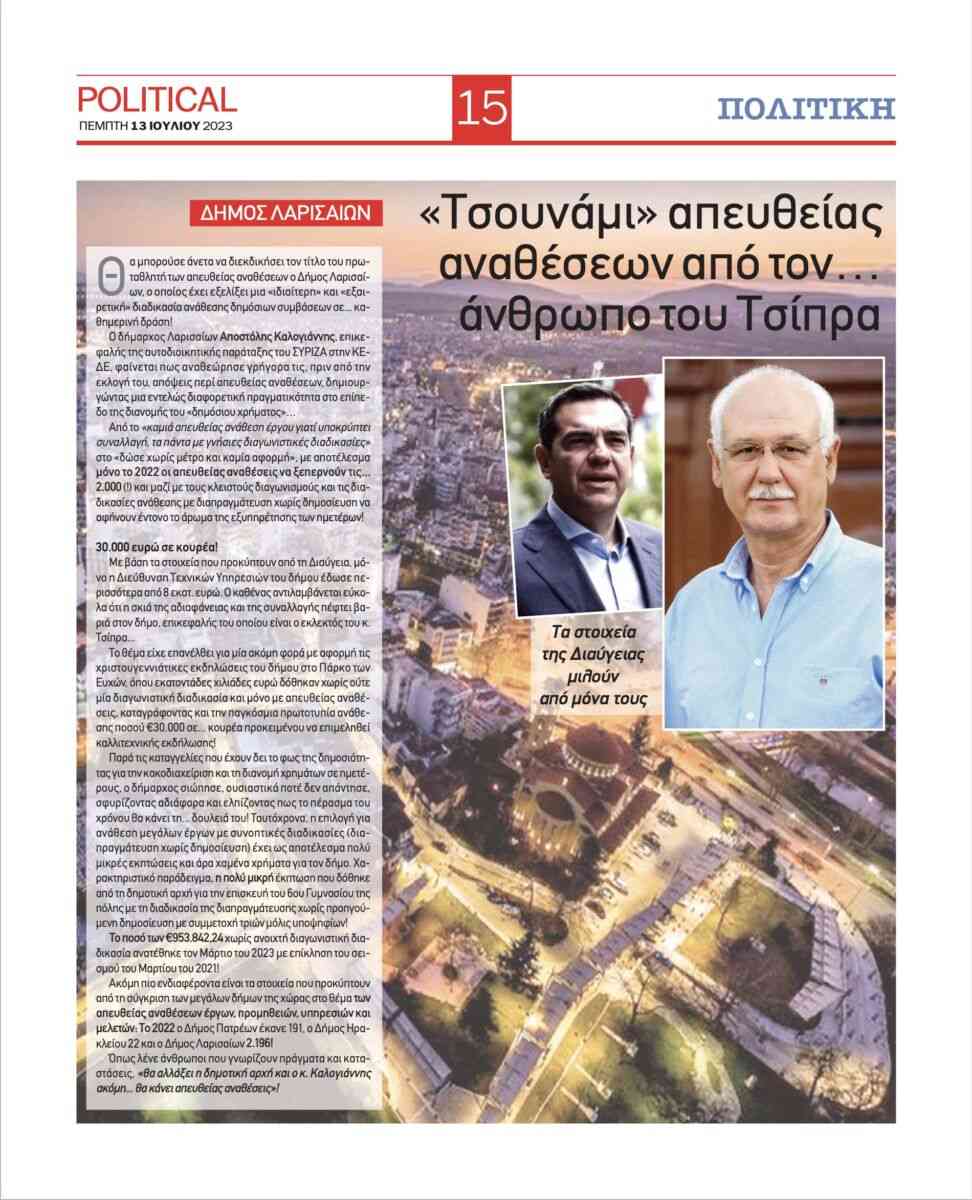 εφημερίδας με τον τίτλο «Δήμαρχος Λαρισαίων: Πώς ο εκλεκτός του Τσίπρα
