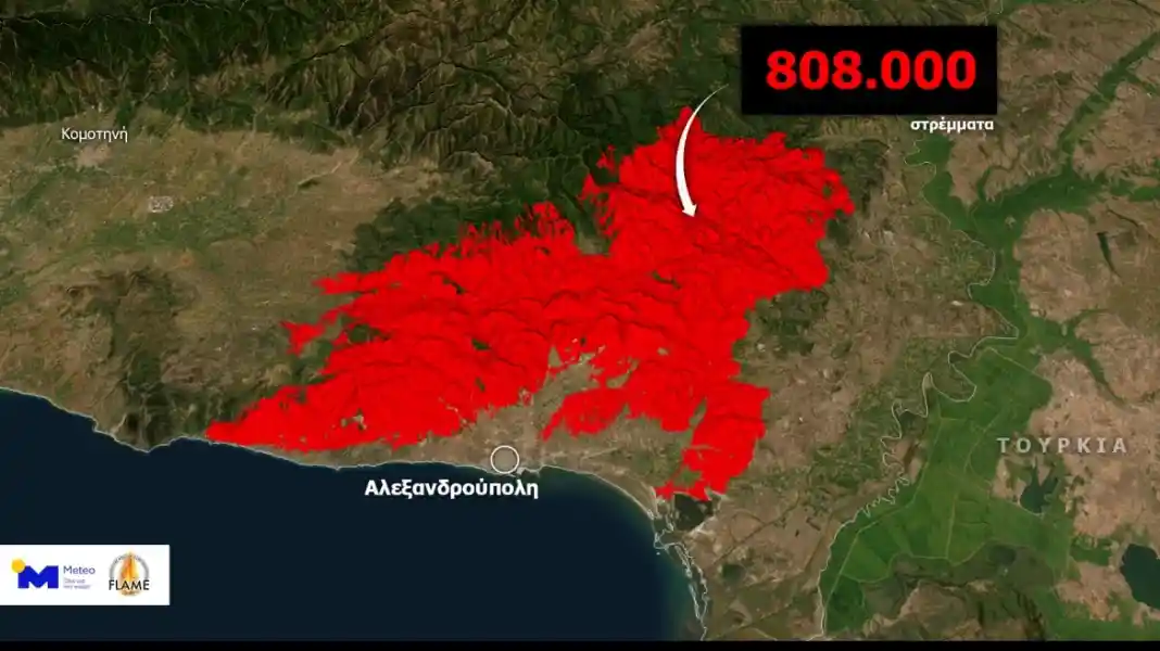 Όπως προκύπτει από την ανάλυση των δορυφορικών δεδομένων, η συνολική έκταση που κατέκαψε η δασική πυρκαγιά του Έβρου, η οποία προέκυψε από τη συνένωση των πυρκαγιών σε Αλεξανδρούπολη και Δαδιά, ξεπερνά τα 808.000 στρέμματα (έως την 28.08.2023, 12:28 τοπική ώρα).