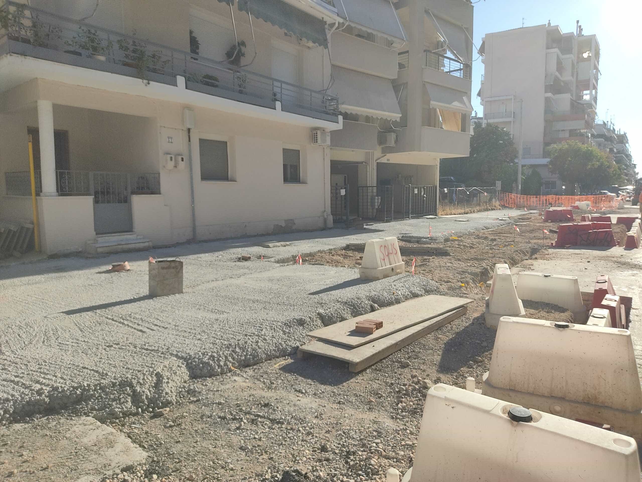 σκυροδέτηση των πεζοδρομίων και των θέσεων στάθμευσης (στη δεξιά πλευρά κατά τη
