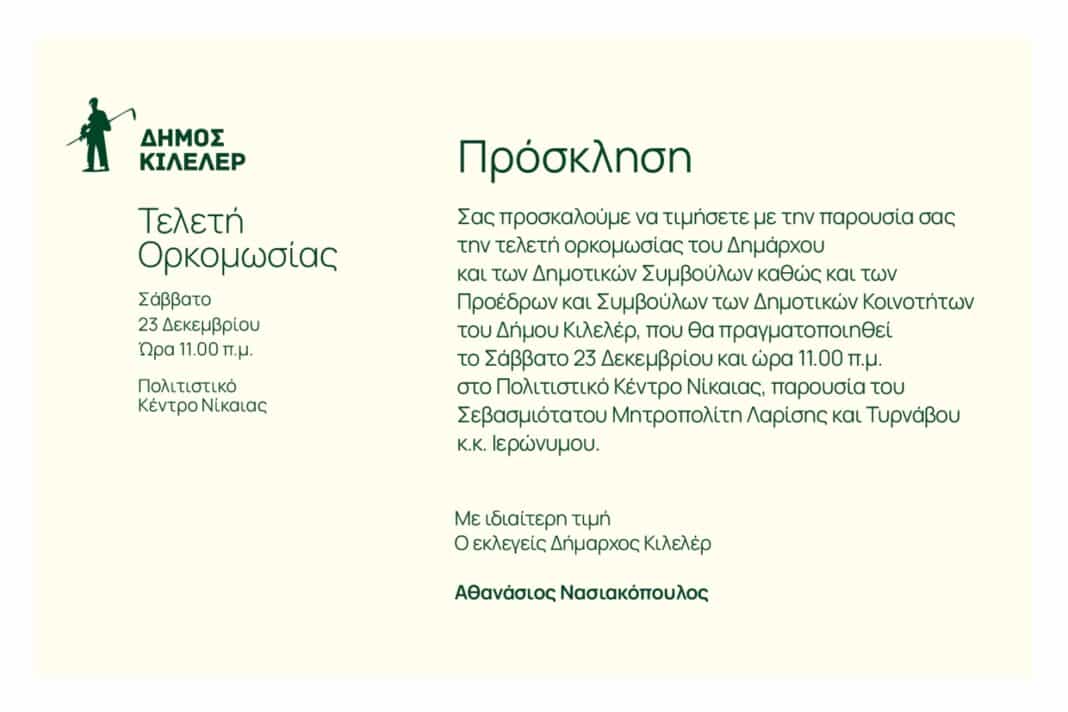 Ο εκλεγείς δήμαρχος Κιλελέρ Αθανάσιος Νασιακόπουλος καλεί αύριο Σάββατο 23 Δεκεμβρίου στις 11:00 το πρωί στο Πολιτιστικό Κέντρο Νίκαιας, στην τελετή ορκωμοσίας του Δημάρχου των μελών του Δημοτικού Συμβουλίου και των Προέδρων και Συμβούλων των Τοπικών Κοινοτήτων του Δήμου Κιλελέρ. Την ορκωμοσίας θα τελέσει ο Μητροπολίτης Λαρίσης και Τυρνάβου σεβασμιότατος κ.κ. Ιερώνυμος.
