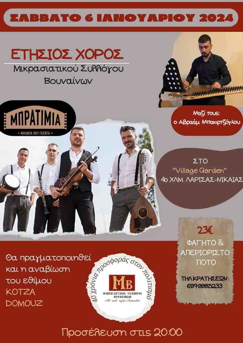 Ο Μικρασιατικός Σύλλογος Βουναίνων «Η καθ’ ημάς Ανατολή» του Δήμου Κιλελέρ διοργανώνει τον ετήσιο χορό του το Σάββατο 6 Ιανουαρίου στο Village Garden (4 ο χλμ. Νίκαιας Λάρισας). Θα εμφανιστούν «Τα μπρατίμια», η μπάντα που γλεντά. Μαζί τους ο
