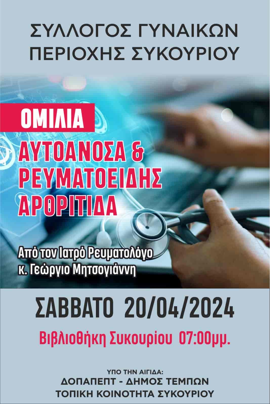 Ο Γυναικών Σύλλογος περιοχής Συκουρίου υπό την αιγίδα του Δήμου Τεμπών, της Αντιδημαρχίας Κοινωνικής Προστασίας, Παιδείας, Πολιτισμού και Τουρισμού και της Δημοτικής Κοινότητας Συκουρίου, καλεί τα μέλη και τους φίλους του, στην ομιλία που θα πραγματοποιηθεί από τον ιατρό ρευματολόγο κ Γεώργιο Μητσογιάννη, το Σάββατο 20 Απριλίου 2024, ώρα 7μμ. στη Βιβλιοθήκη Συκουρίου, με θέμα : Αυτοάνοσα Νοσήματα και Ρευματοειδής Αρθρίτιδα.