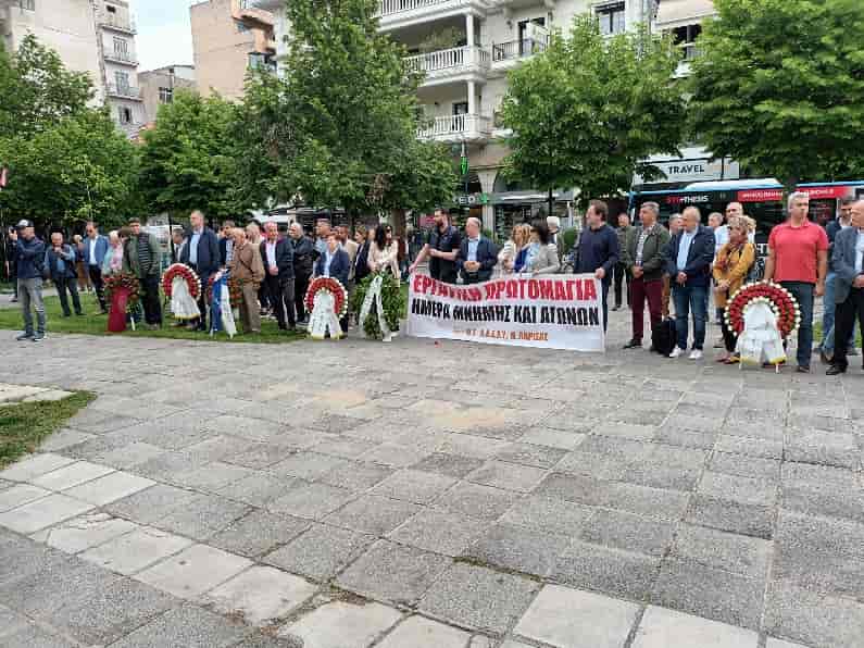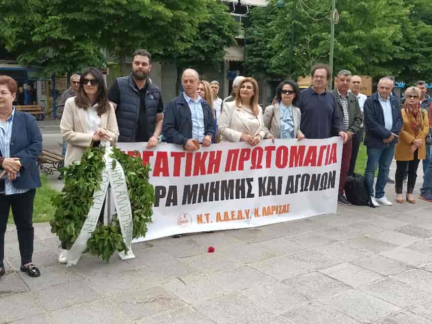 Απεργιακή συγκέντρωση για την Πρωτομαγιά πραγματοποιήθηκε από το ν.τ. της ΑΔΕΔΥ Λάρισας, το πρωί της Τετάρτης, στις 10:00 π.μ., στο μνημείο της πλατείας Ρήγα Φεραίου (πρώην Νομαρχίας). Μετά το πέρας της συγκέντρωσης ακολούθησε κατάθεση στεφάνων.