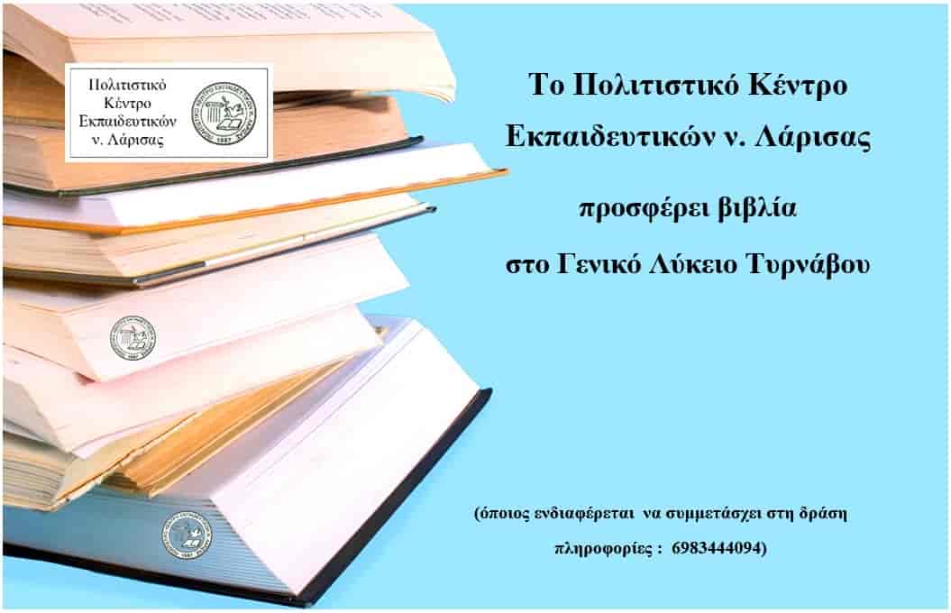 Το Πολιτιστικό Κέντρο Εκπαιδευτικών ν. Λάρισας – ΠΟΚΕΛ συνεχίζει να προσφέρει βιβλία σε σχολικές βιβλιοθήκες κι αυτή τη φορά επέλεξε να δώσει βιβλία στο ΓΕΛ Τυρνάβου, για τον εμπλουτισμό με διάφορους τίτλους, μετά από πρόσκληση της διευθύντριας του σχολείου, Πατσής Κωνσταντίνας και του Συλλόγου Διδασκόντων.
