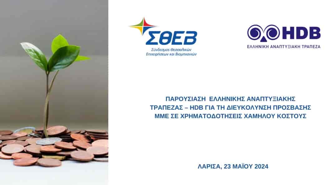 Την Πέμπτη 23 Μαΐου και ώρα 19:00 στις εγκαταστάσεις του ΣΘΕΒ στη Λάρισα θα πραγματοποιηθεί συνάντηση γνωριμίας των μελών του Συνδέσμου με την ΕΛΛΗΝΙΚΗ ΑΝΑΠΤΥΞΙΑΚΗ ΤΡΑΠΕΖΑ, στην οποία θα συμμετέχει ο Πρόεδρός της κ. Γιώργο Ζαββός και η Διευθύνουσα Σύμβουλος κα Ισμήνη Παπακυρίλλου.