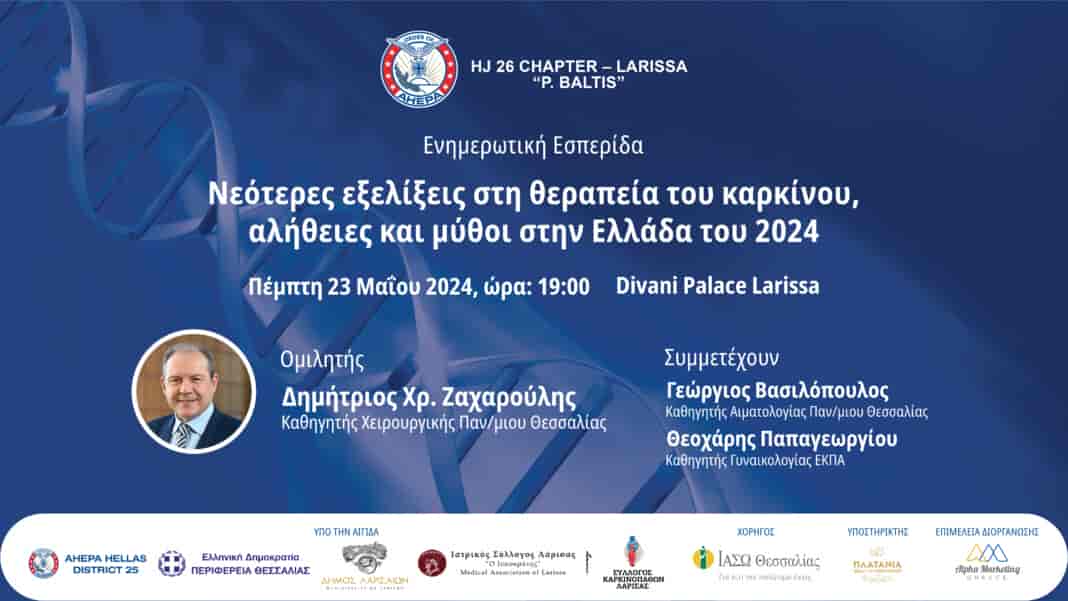 Στο πλαίσιο των ενημερωτικών εκδηλώσεων, το Τμήμα της ΑΧΕΠΑ Λάρισας “P. Baltis”, διοργανώνει σήμερα Πέμπτη 23 Μαΐου στις 19:00, στο Ξενοδοχείο Divani Palace, ενημερωτική εσπερίδα, με ελεύθερη είσοδο, με σκοπό να ενημερωθεί το κοινό για θέματα που αφορούν στις τελευταίες εξελίξεις στο χώρο της Ιατρικής, σχετικά με την αντιμετώπιση του καρκίνου.