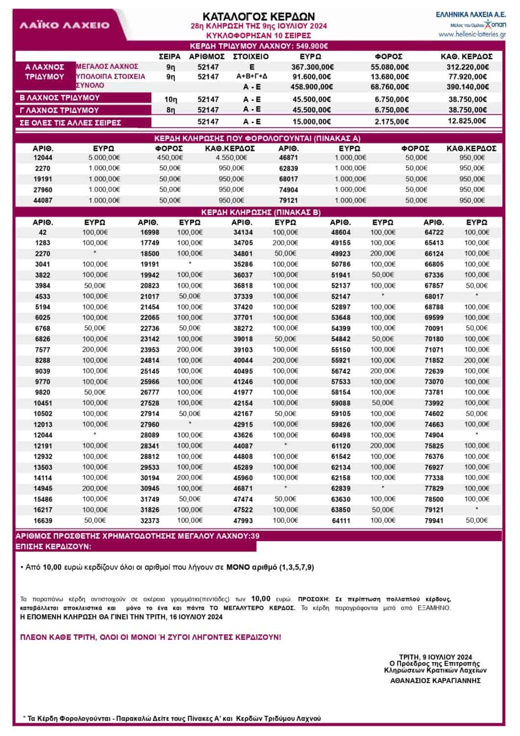 Ο τυχερός αριθμός ήταν ο 52147 στην 9η, 10η και 8η σειρά.