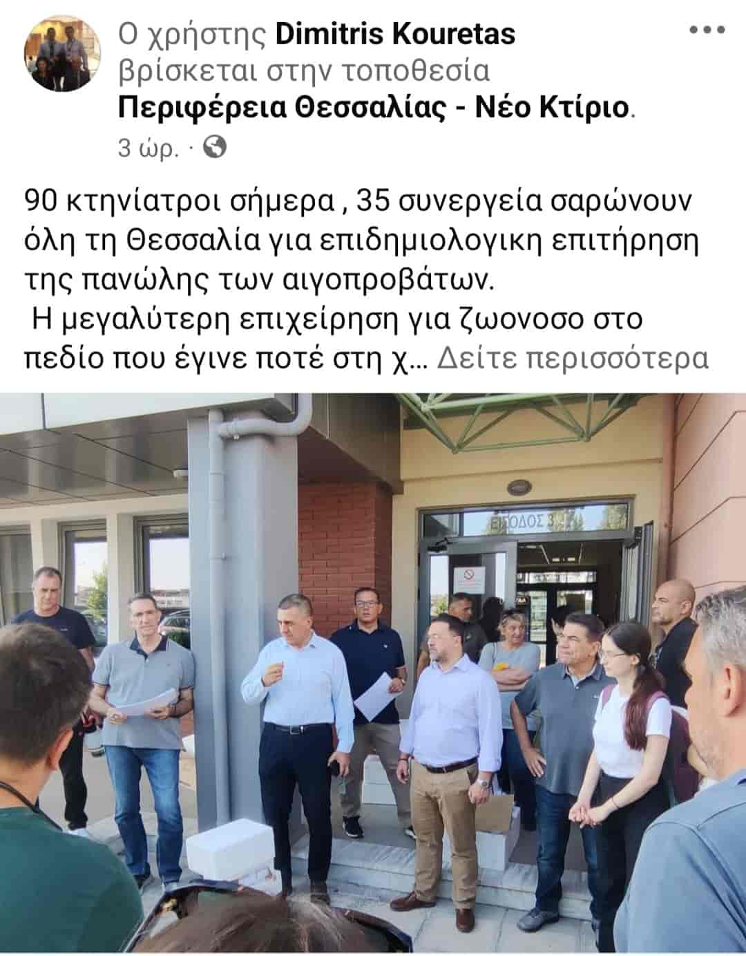 O περιφερειάρχης Θεσσαλίας Δημήτρης Κουρέτας εξέλιξη βρίσκονται οι έλεγχοι στις κτηνοτροφικές μονάδες της Θεσσαλίας με 90 κτηνιατρους και 35 συνεργεία για τον περιορισμό της πανώλης και τον εντοπισμό νέων κρουσμάτων.