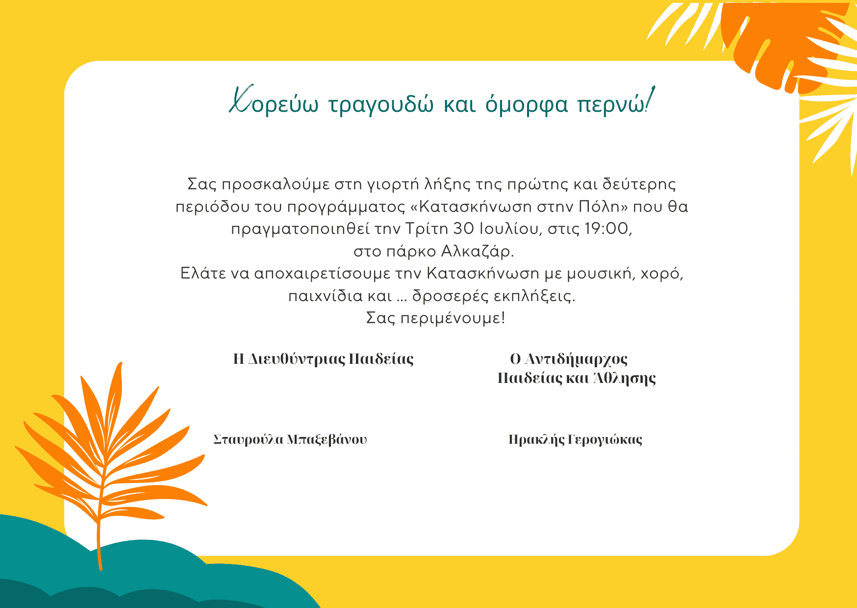 Με μια πολύ όμορφη γιορτή αποχαιρετούν την «Κατασκήνωση στην πόλη» οι μικρές μαθήτριες και οι μικροί μαθητές της Α’ και Β΄περιόδου, καθώς σήμερα, Τρίτη, 30 Ιουλίου, θα πραγματοποιηθεί ειδική εκδήλωση, στις 7 μ.μ., στο Πάρκο Αλκαζάρ.