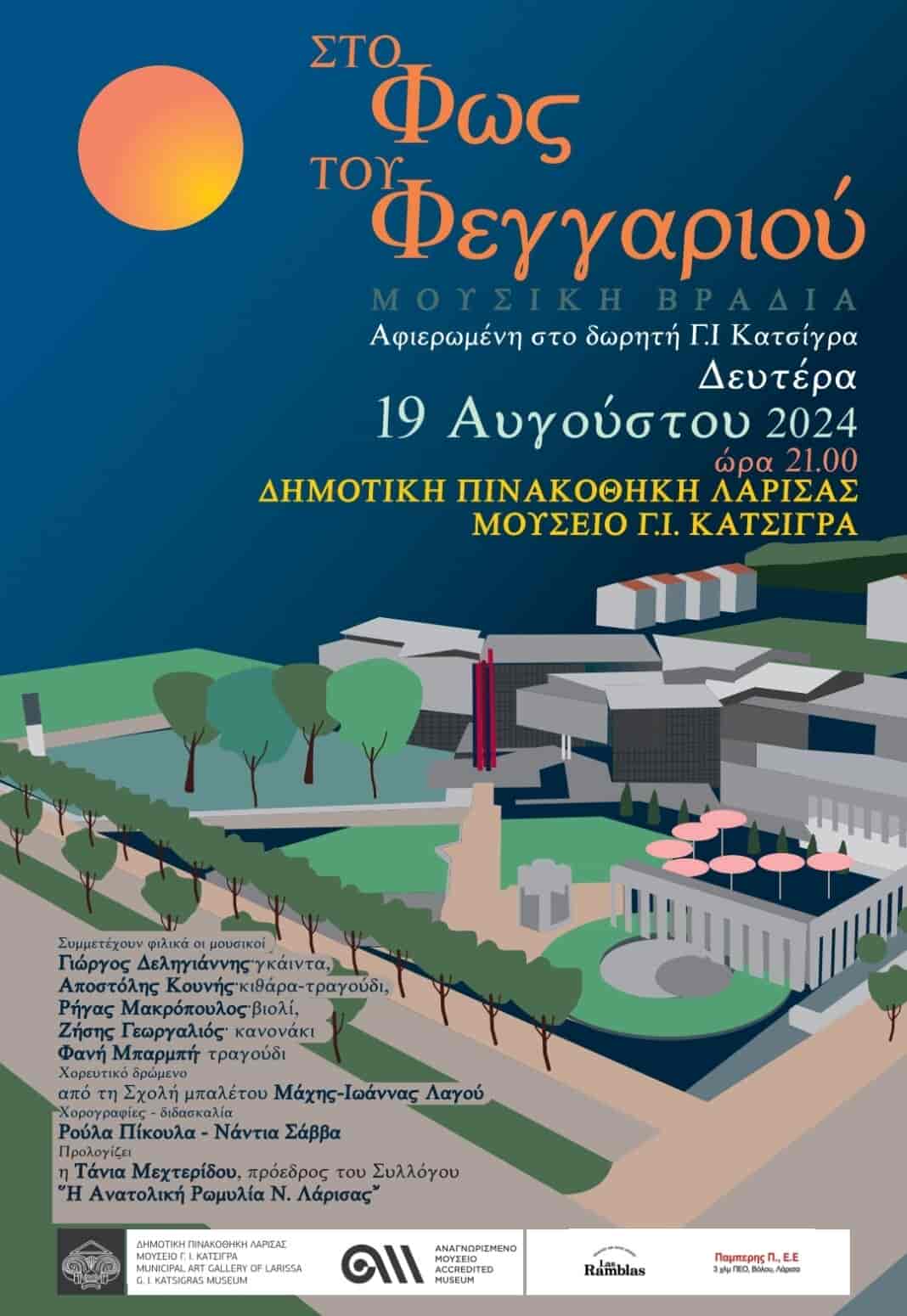 Τη Δευτέρα 19 Αυγούστου, και ώρα 9:00 μ.μ., τη βραδιά του αυγουστιάτικου φεγγαριού, η Δημοτική Πινακοθήκη Λάρισας – Μουσείο Γ. Ι. Κατσίγρα συμμετέχει στο φετινό εορτασμό των εκδηλώσεων σ’ όλους τους αρχαιολογικούς χώρους και τα μουσεία της χώρας, με μια εκδήλωση αφιερωμένη στο δωρητή της, Γ. Ι. Κατσίγρα.