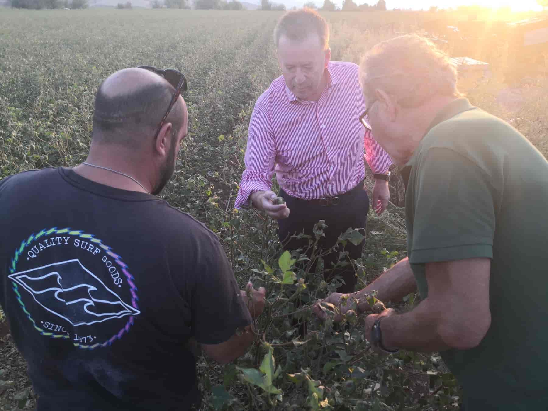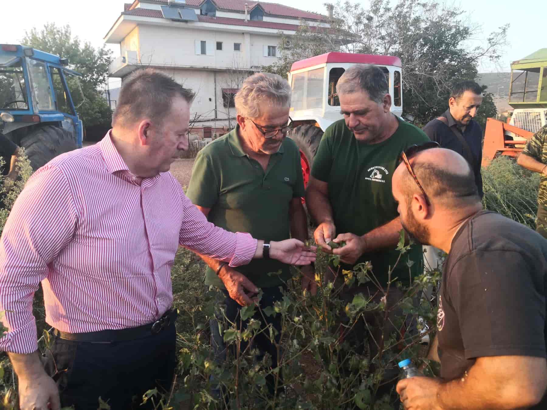 Μαζί με πληγέντες παραγωγούς, ο κ. Κόκκαλης πραγματοποίησε αυτοψία σε καλλιεργούμενες εκτάσεις, διαπιστώνοντας το μέγεθος του προβλήματος.