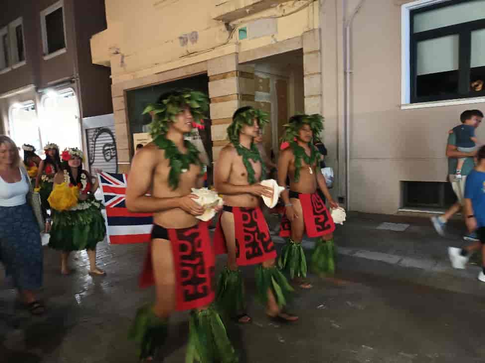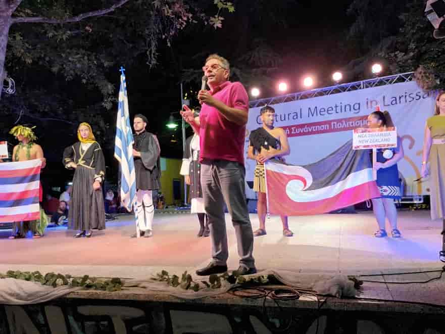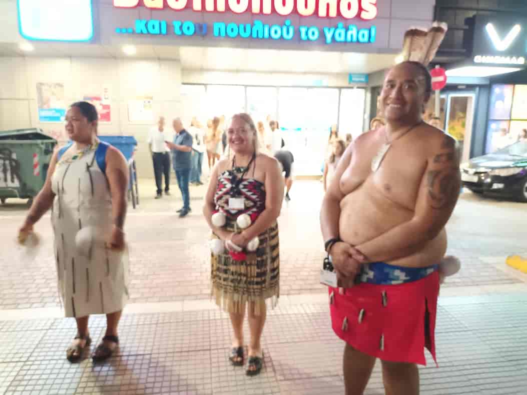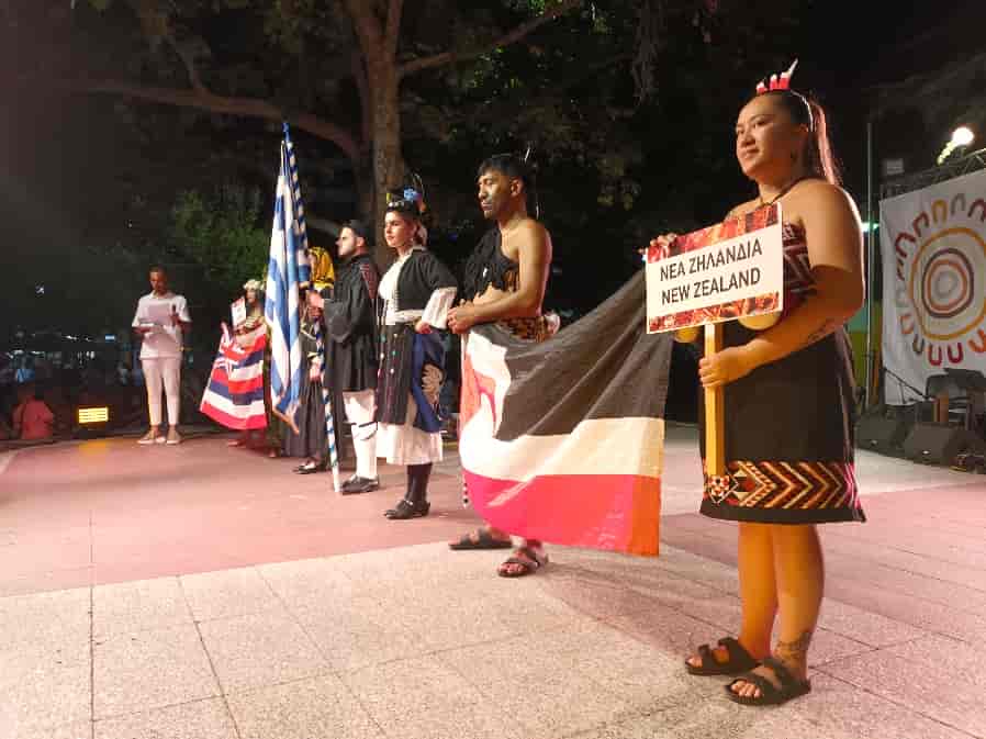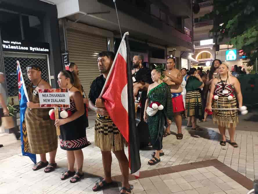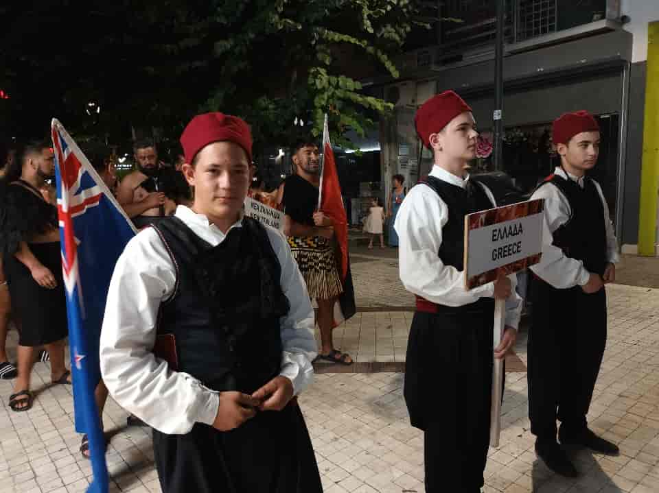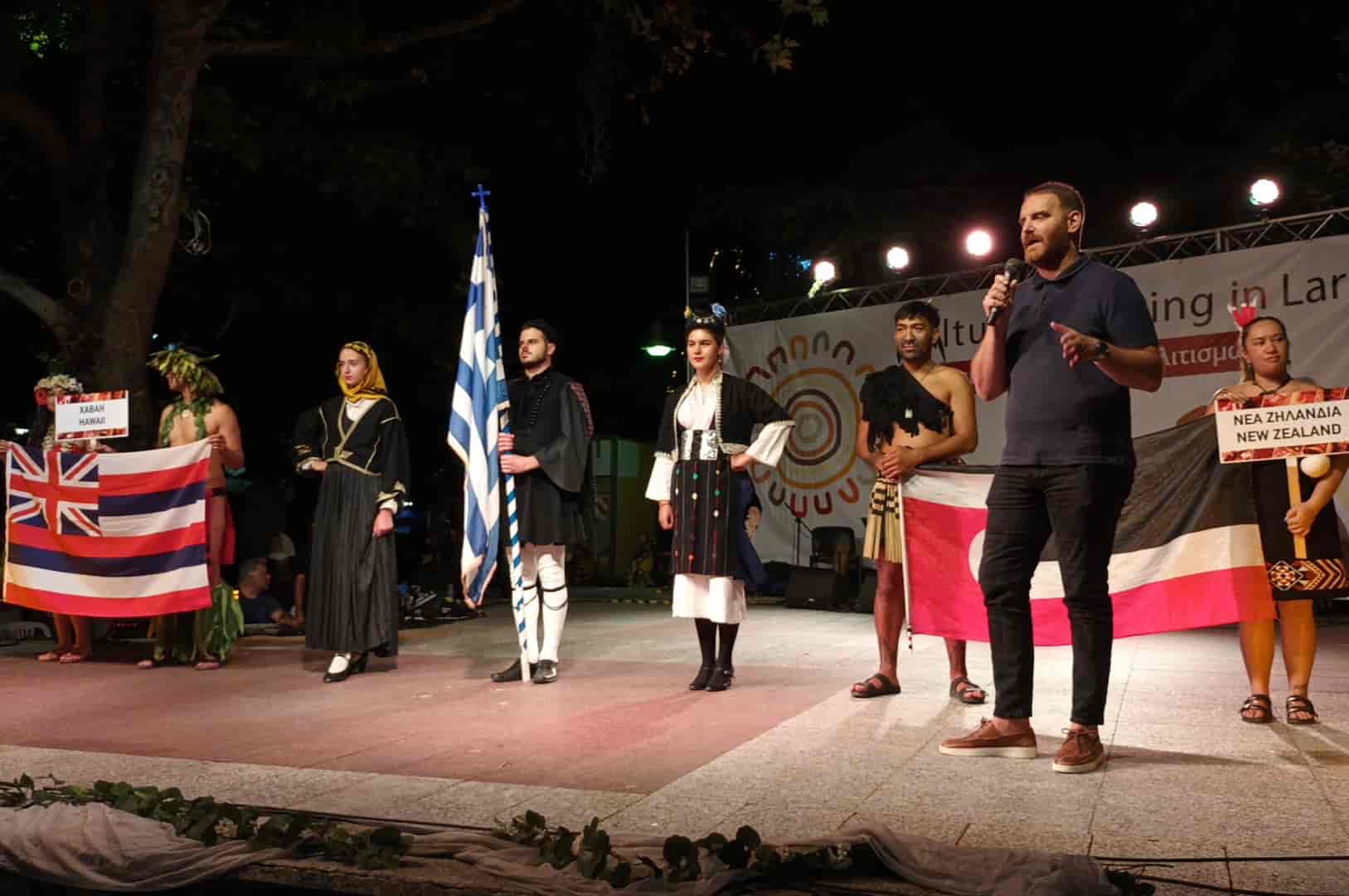 50 χορευτές και μουσικοί από τη Νέα Ζηλανδία και τη Χαβάη ξεκίνησαν από την αρχή της οδού Κούμα και διέσχισαν τους κεντρικούς δρόμους της πόλης υπό τους ήχους παραδοσιακών οργάνων. Μπροστά στο Αρχαίο Θέατρο της Λάρισας χόρεψαν παραδοσιακούς χορούς τραβώντας τα βλέμματα των λαρισαίων περαστικών. Στην συνέχει η πομπή κατευθύνθηκε στην Κεντρική Πλατεία όπου και ολοκληρώθηκε με ομιλίες και χορευτικά η έναρξη της όμορφης αυτής εκδήλωσης. Από τη Νέα Ζηλανδία συμμετείχε η χορευτική ομάδα Wheiao Haka και από την Χαβάη η Hawaiian Pacific Magic.