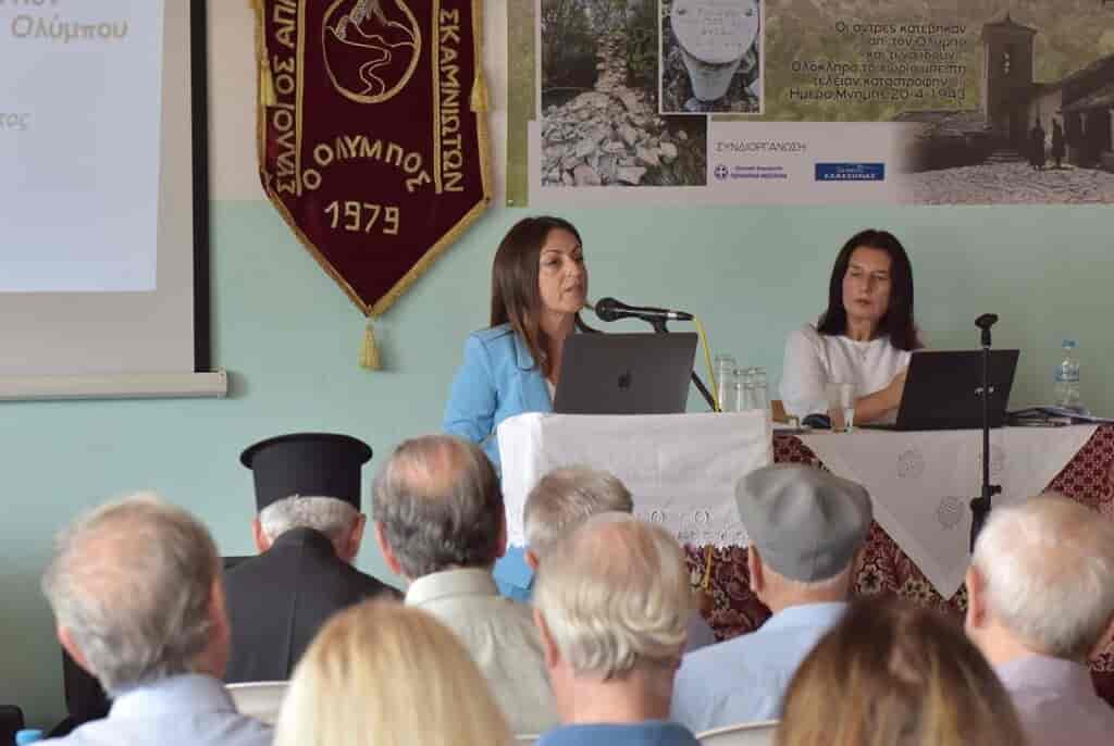 Μεταξύ αυτών που χαιρέτισαν την εκδήλωση είναι ο πατέρας Βασίλειος Παπανικολάου, εκπρόσωπος του Μητροπολίτη Ελασσόνας κ. Χαρίτωνα, από την Ιερά Μονή Αγίας Τριάδας Σπαρμού Ελασσόνας, στην οποία φυλάσσονται σήμερα εικόνες και κειμήλια της εκκλησίας της Αγίας Τριάδας Παλιάς Σκαμνιάς, στολίδι κάτω από την κορυφή «Εννέα Πύργοι» του Ολύμπου, μοναδικό σωσμένο κτίσμα από τη λαίλαπα του ναζισμού. Χαιρέτισαν επίσης ο αρχιτέκτονας Βασίλειος Τσολάκης, ο οποίος με πολύ μεράκι ανέδειξε σε ντοκιμαντέρ την ιστορία του τόπου, ο εκδότης του Θεσσαλικού Ημερολογίου Κώστας Σπανός, στο οποίο δημοσιεύτηκαν κείμενα για την ιστορία της Σκαμνιάς και ο ομότιμος καθηγητής Ιατρικής του ΑΠΘ Ιωάννης Αγοραστός, ο οποίος αναφέρθηκε στην κατοίκηση της Παλιάς Σκαμνιάς.